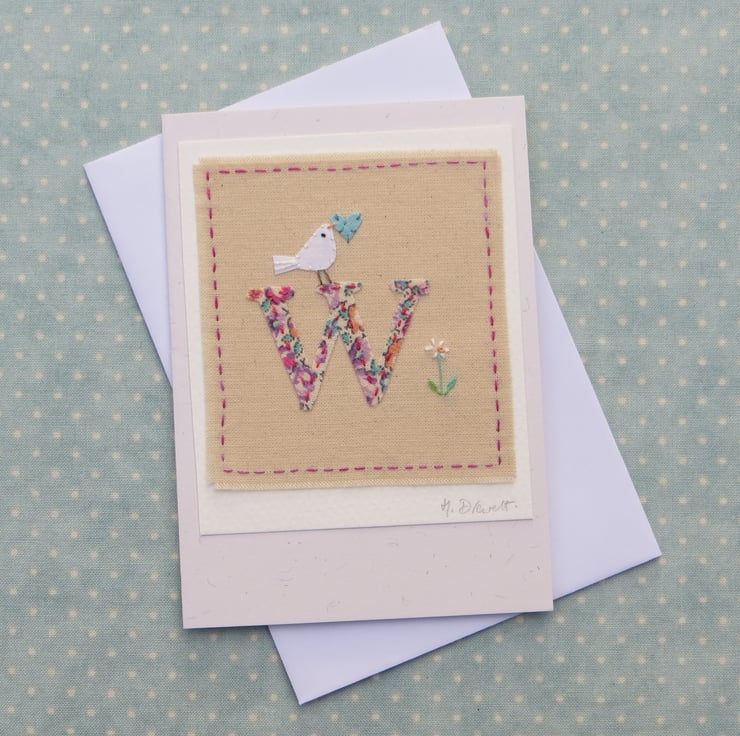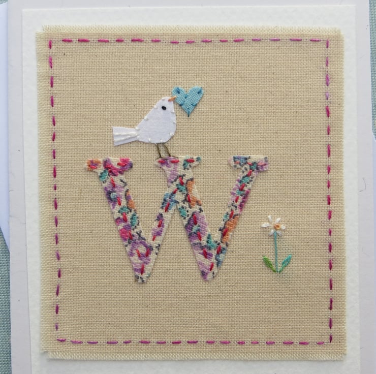 A hand-stitched card with the letter 'W' cut from pretty cotton fabric stitched into place with tiny stitches. I have added a miniature applique dove with heart in her beak, and then embroidered a tiny daisy flower to complete the design.
