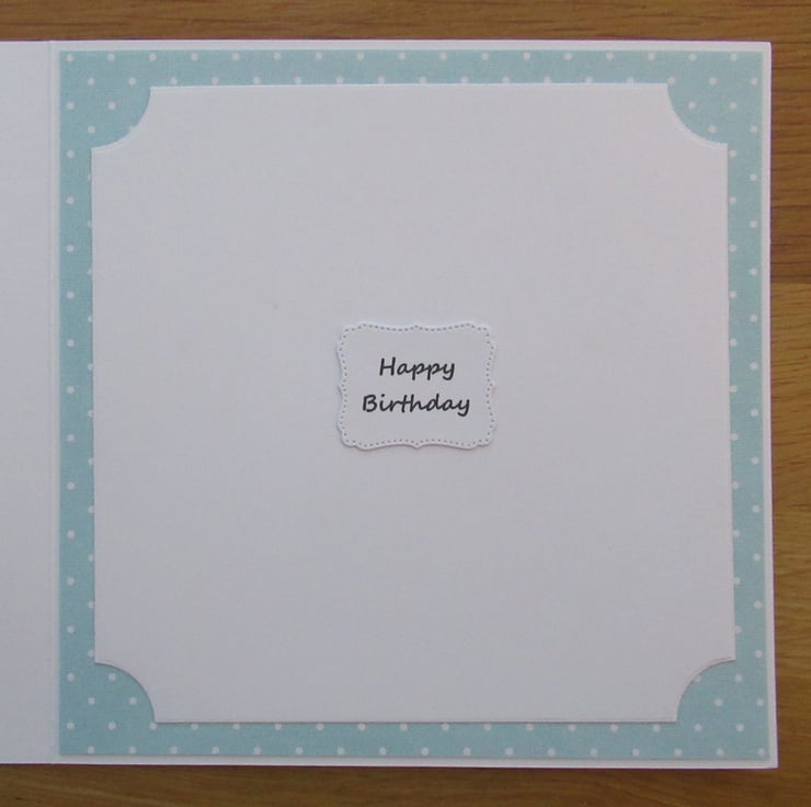 A pretty aqua blue 7x7 inch card featuring the image of young girl fairy blowing dandelion clocks into the sky. The card has multiple die cut shaped layers in shades of aqua/blue/green plus a silver mat surrounding the image itself and the card is embellished with a soft blue satin bow and a happy birthday greeting. The inside of the card coordinates with the front and has a simple happy birthday message.