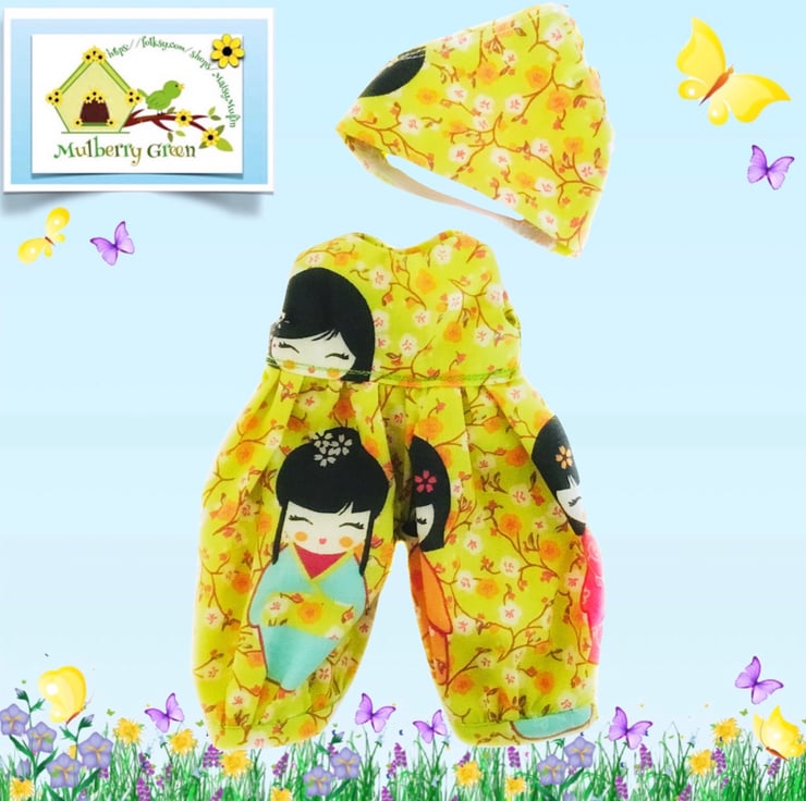 A really cute little playsuit with a matching headscarf in a cherry blossom and Japanese doll print to fit the Mulberry Green characters. The playsuit is made from polycotton, has gathered legs and a lined bodice and comes on a cute little wooden hanger. The headscarf has an elasticated back. It looks good with the pistachio green shortie cardigan.