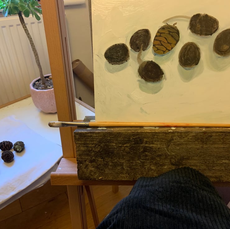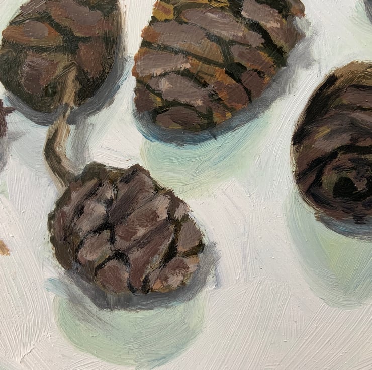 Little painting of pine cones from an enormous Wellingtonia redwood tree in Gelt Woods, Cumbria near where I live. Oil on wood, sold unframed.