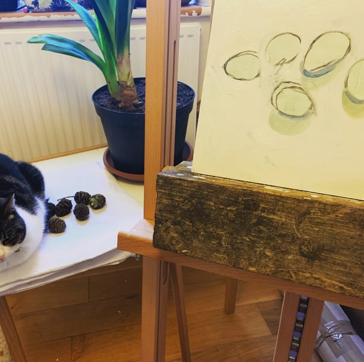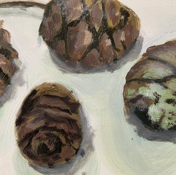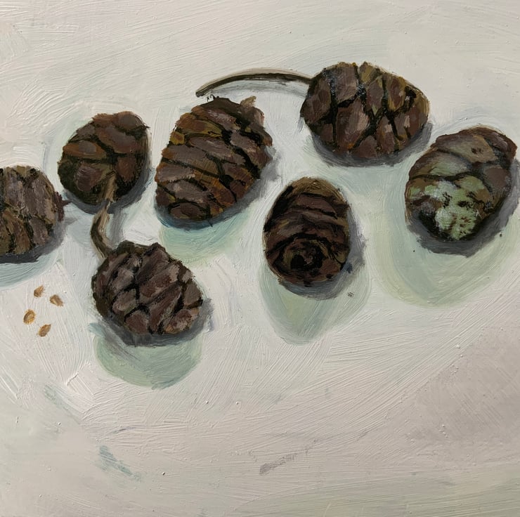 Little painting of pine cones from an enormous Wellingtonia redwood tree in Gelt Woods, Cumbria near where I live. Oil on wood, sold unframed.