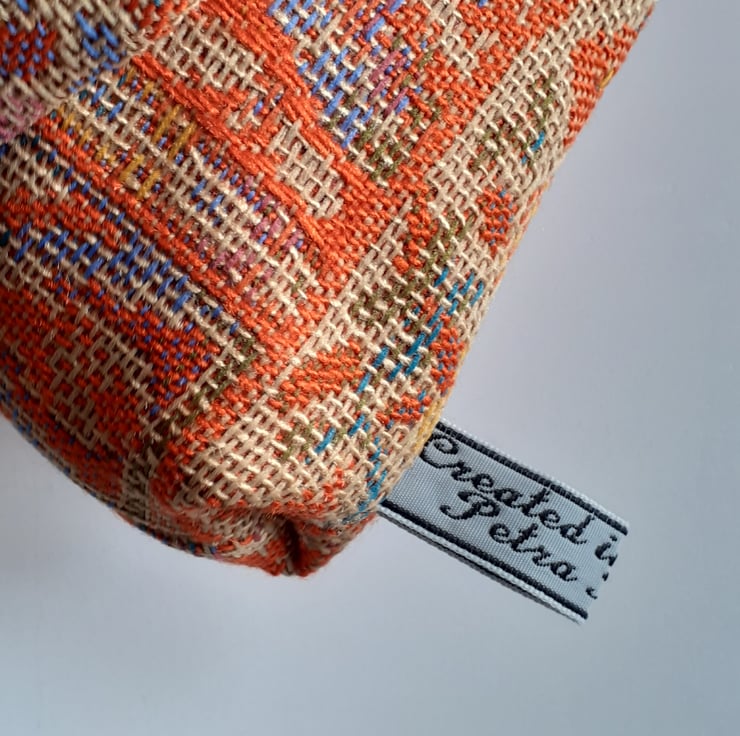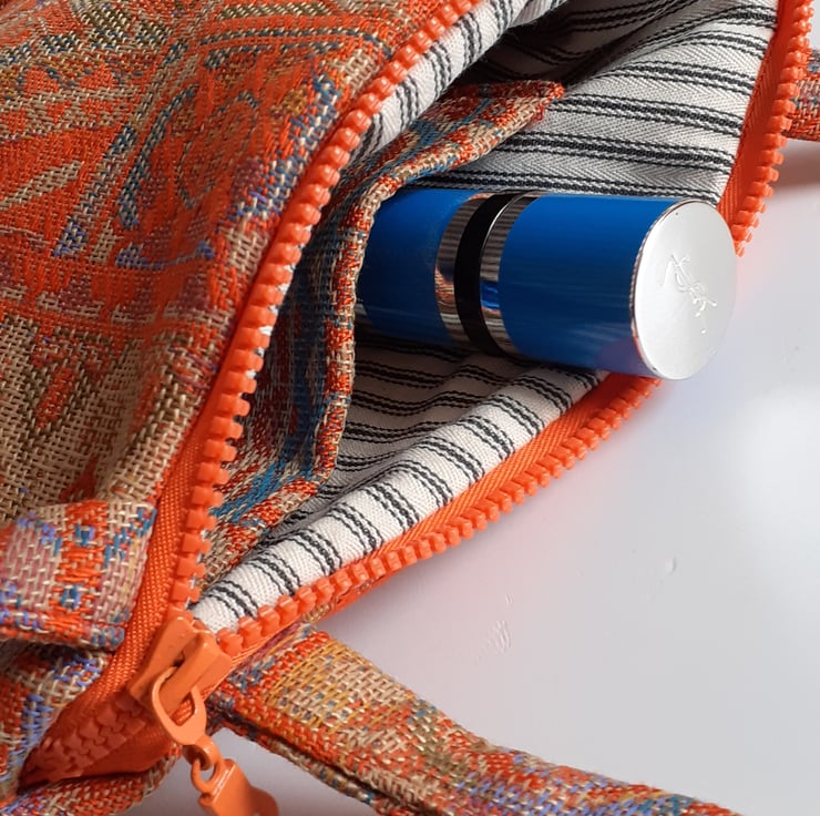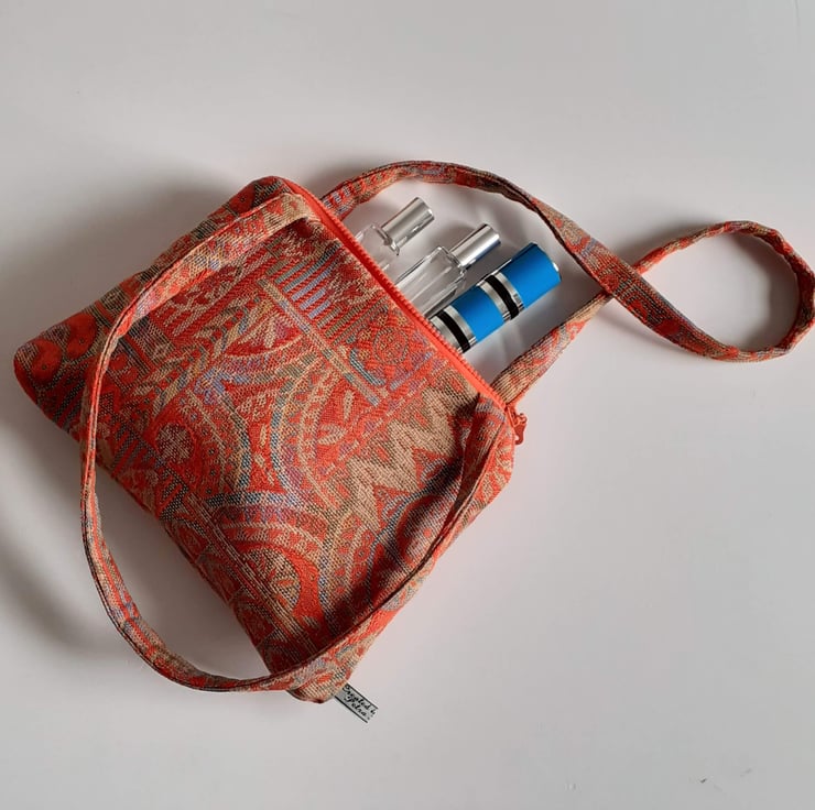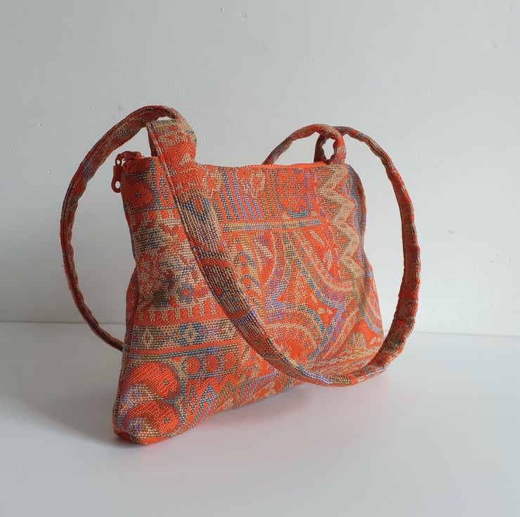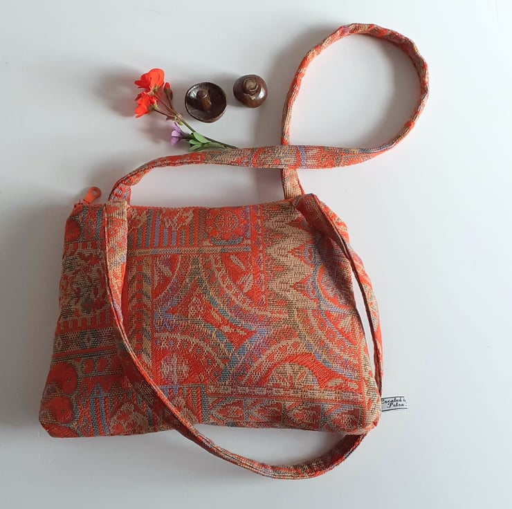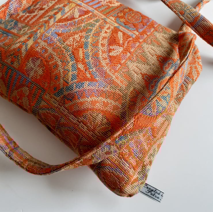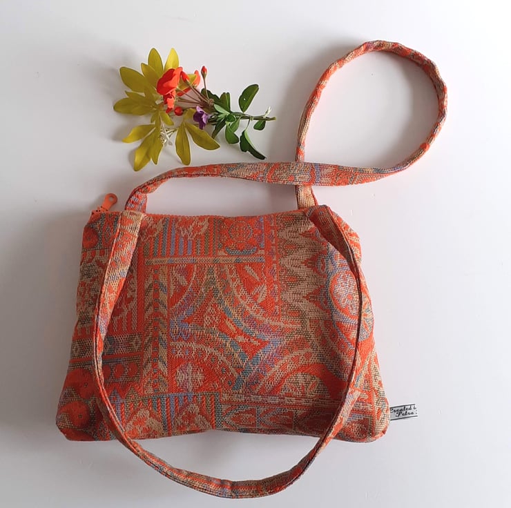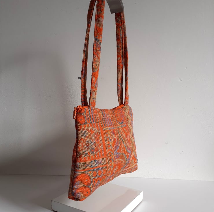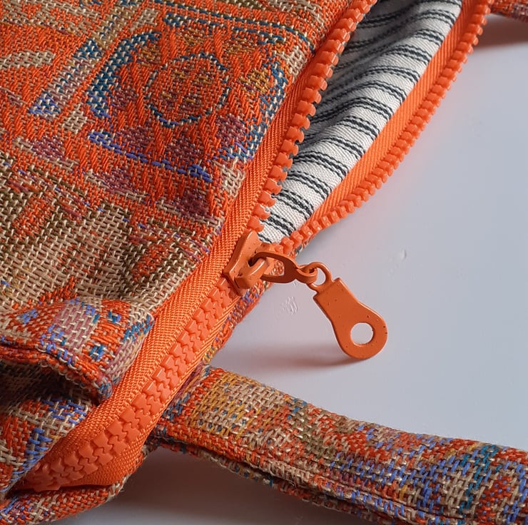 This practical little shoulder bag or handbag is made out of a wonderful fabric with a tapestry effect weave, and comes in an Autumnal colourway of orange, blue and beige. The bag fits neatly under your arm, but is large enough to carry all your essentials with style. There is an internal pocket for the flotsam and jetsam of your life, and it closes with a satisfying chunky zip.
