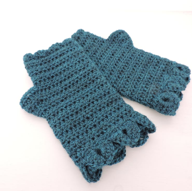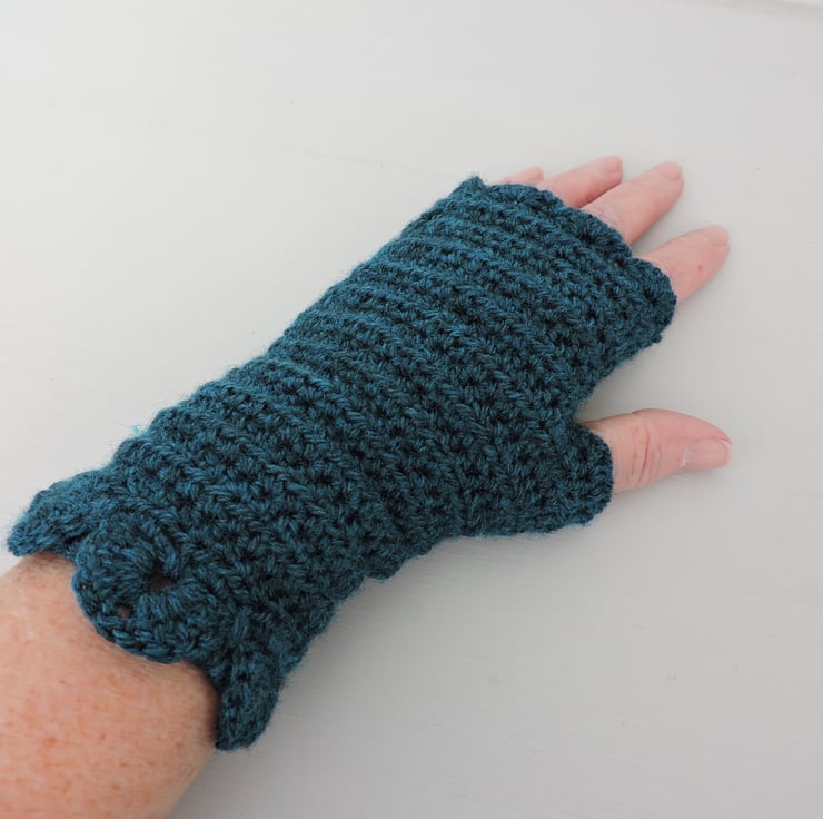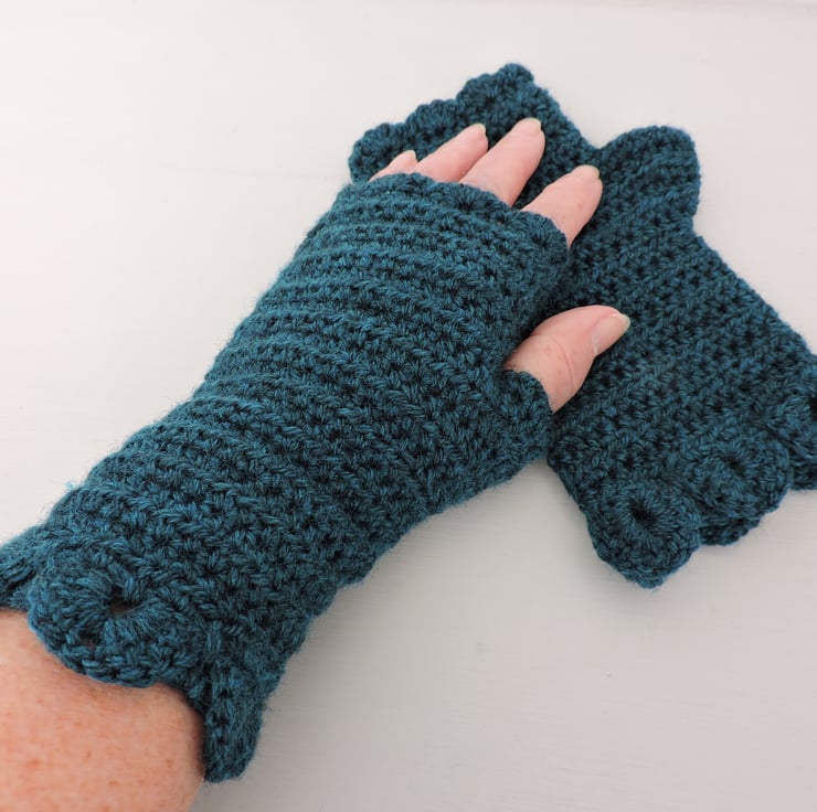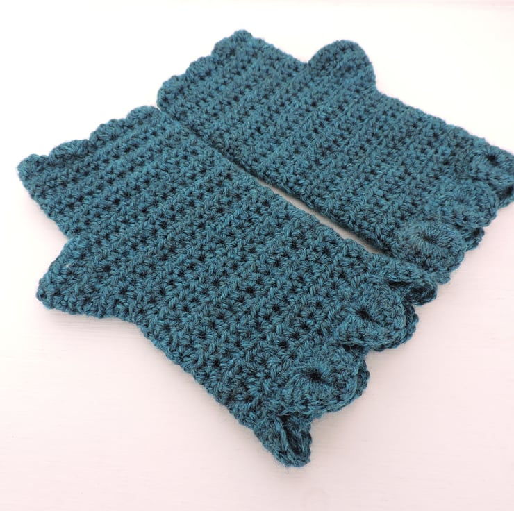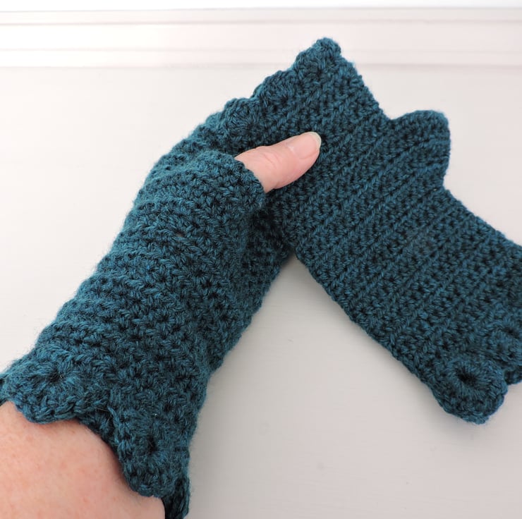 This pair of fingerless Dragon scale cuff mitts have been crocheted with a beautifully soft 100% premium acrylic yarn. A beautiful rich petrel blue green colour.. A plain body with a single row of dragon scales at the cuffs and a wavy edge to the top.. The perfect winter warmer.