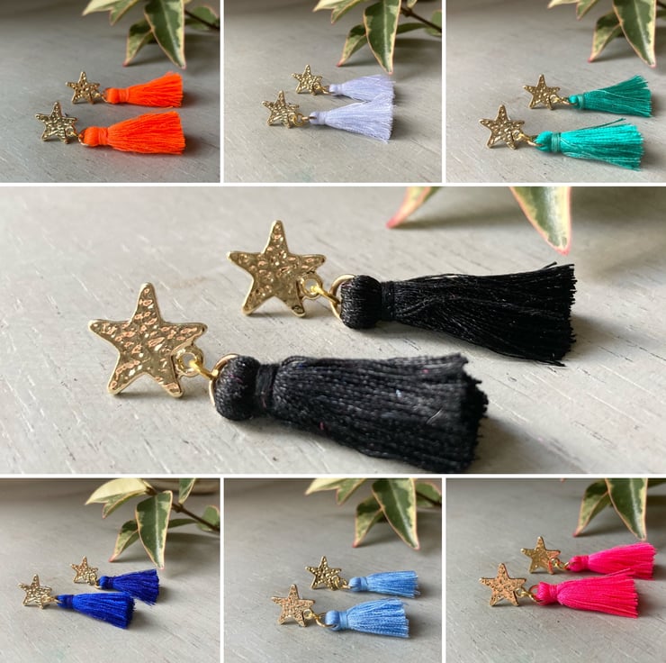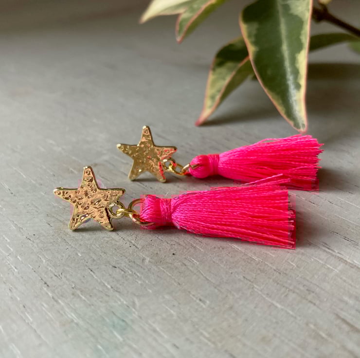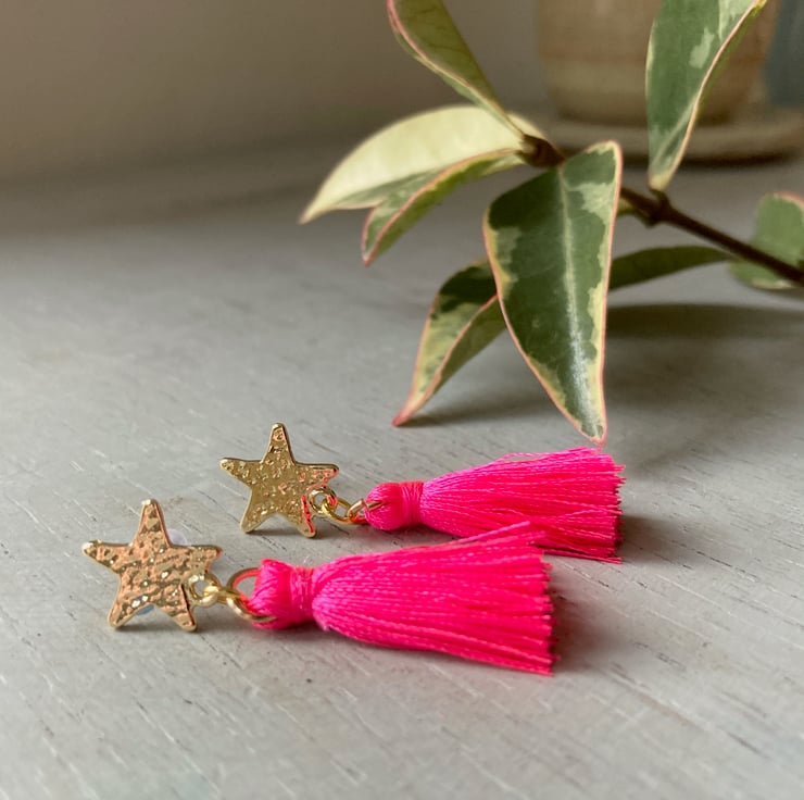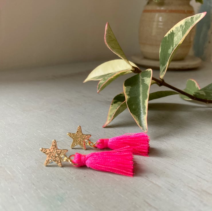 Stunning earrings made with gold-plated star stud earrings and bright pink tassels. Perfect for an evening out or in! The earrings are approximately 4cm long and are also available in other colours.
