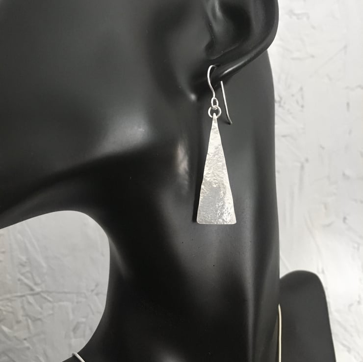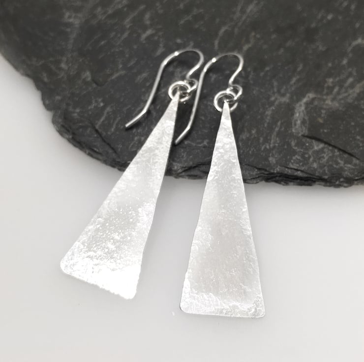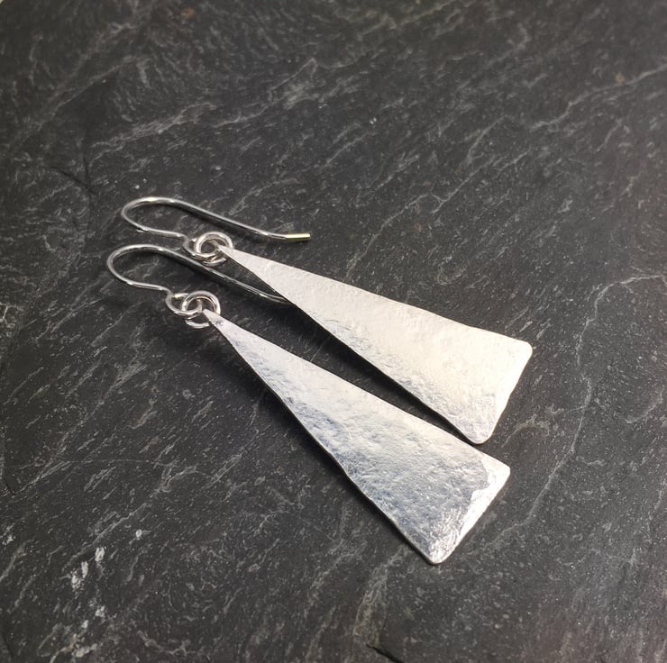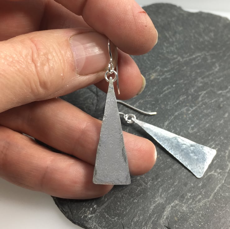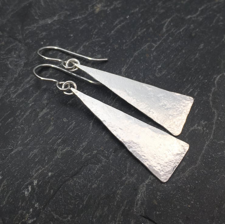 These earrings have been cut from fine silver sheet, they have been textured with hammers and burnished to a subtle shine. I have added a soldered sterling silver ring at the top and hung them from handmade sterling silver hooks.