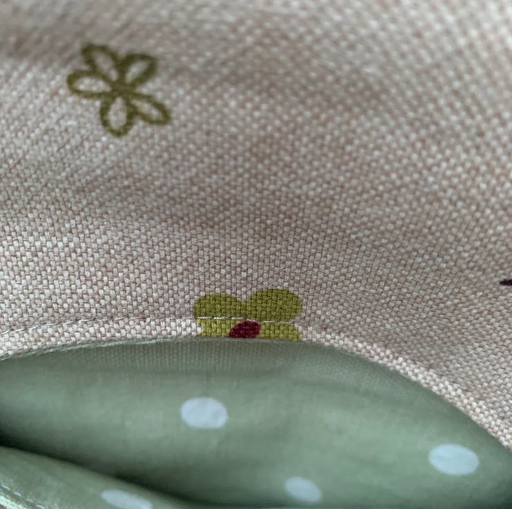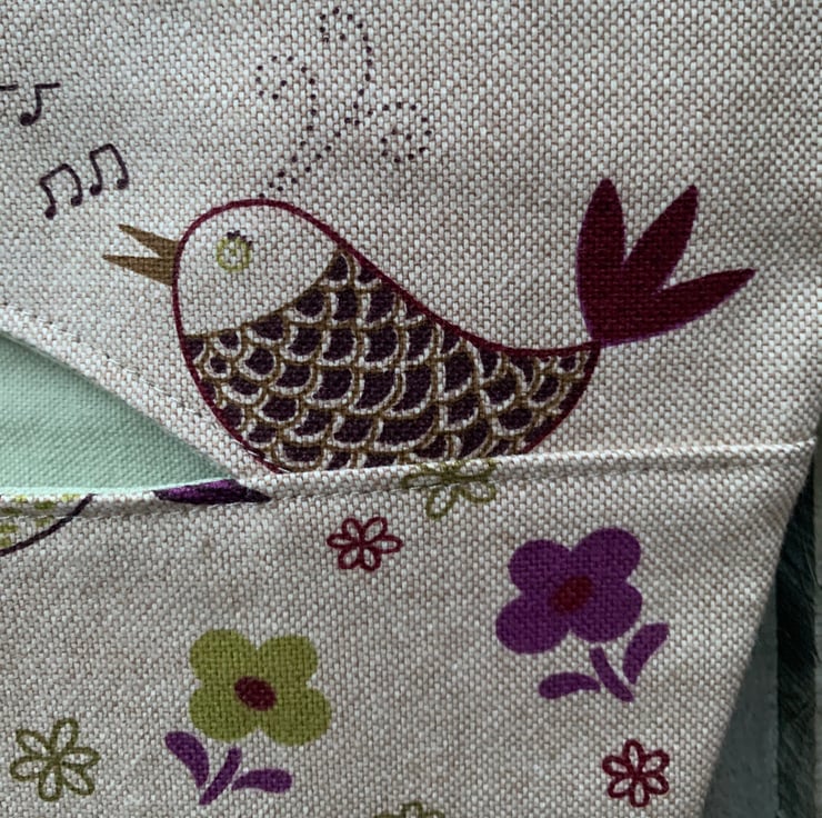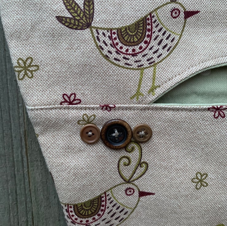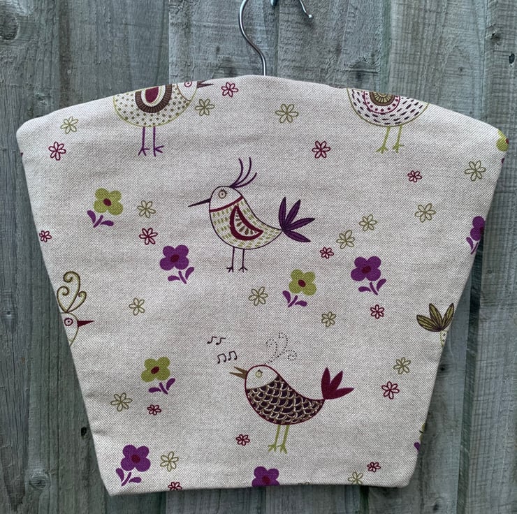 Cute peg bag made from beige cotton fabric printed with flowers and birds.The peg bag is fully lined in a green spotty fabric and trimmed with 3 buttons.