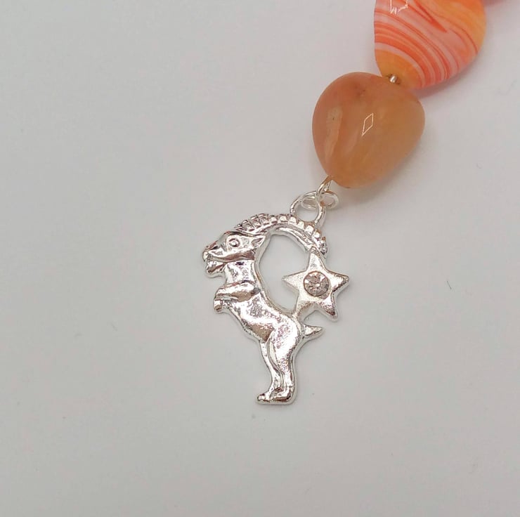 The bookmark is silver plated and in the shape of a squiggle. It has round orange beads, orange heart beads and orange nugget beads with a silver plated capricorn star sign charm made into a beaded chain 12 cms long. The Bookmark is 8 cm in in length.