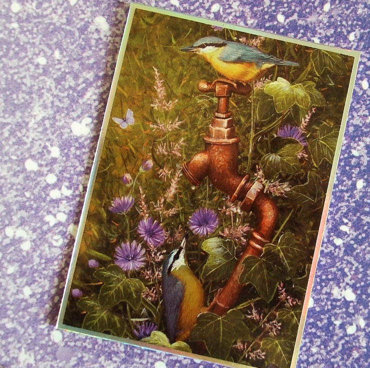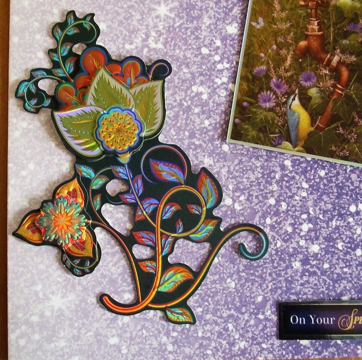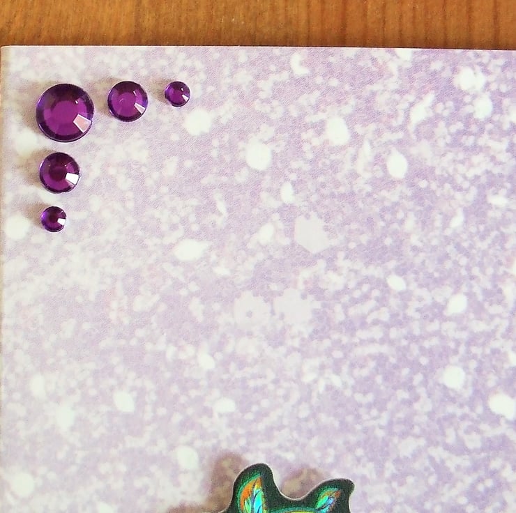 The front of the card is printed to look like sparkly glitter in shades of purple but is actually completely smooth to touch. Onto this I've placed a 3D motif of a flower that looks like it comes from a Fairy Tale or Fantasy Adventure, it is printed on foiled card that has a holographic finish so the colours shine and change with the light. In the top corner is a topper with an image of 2 birds in a meadow perching on an old copper tap, this also has a foiled finish and the colours go from dark to light when it is turned. There are 5 purple faux gems in the top left corner. In the bottom right corner is a greeting with the words "On Your Special Day" making it suitable for many occasions.