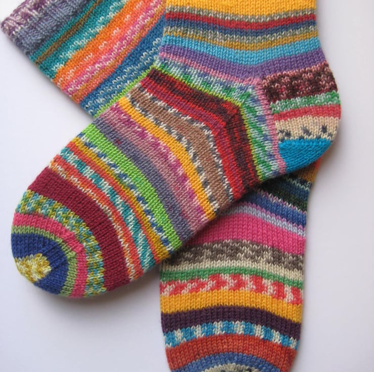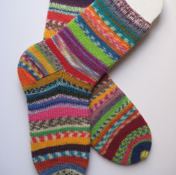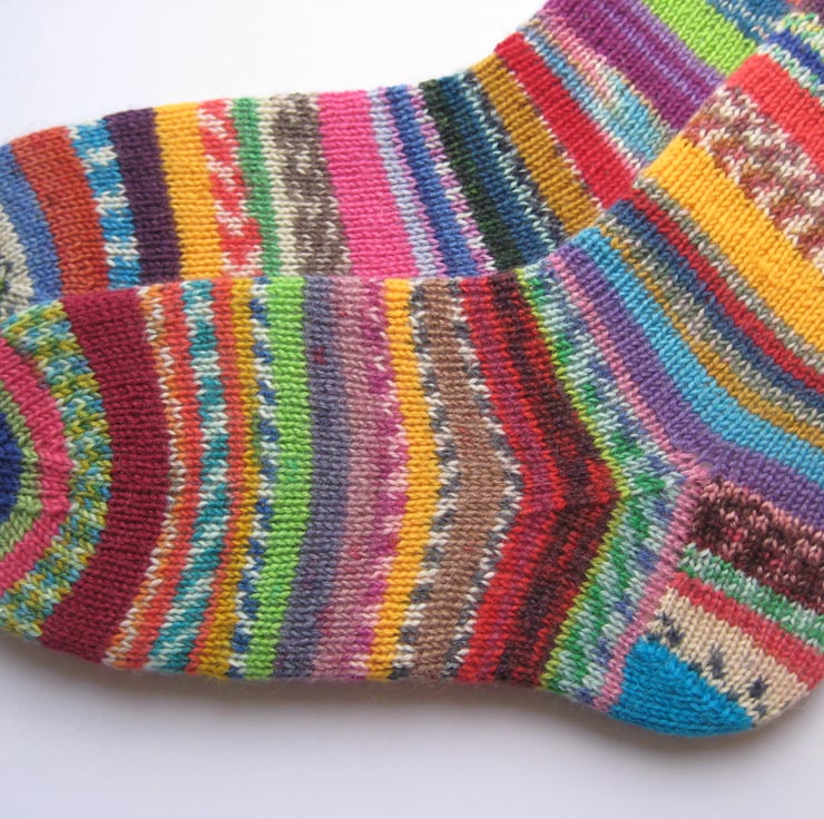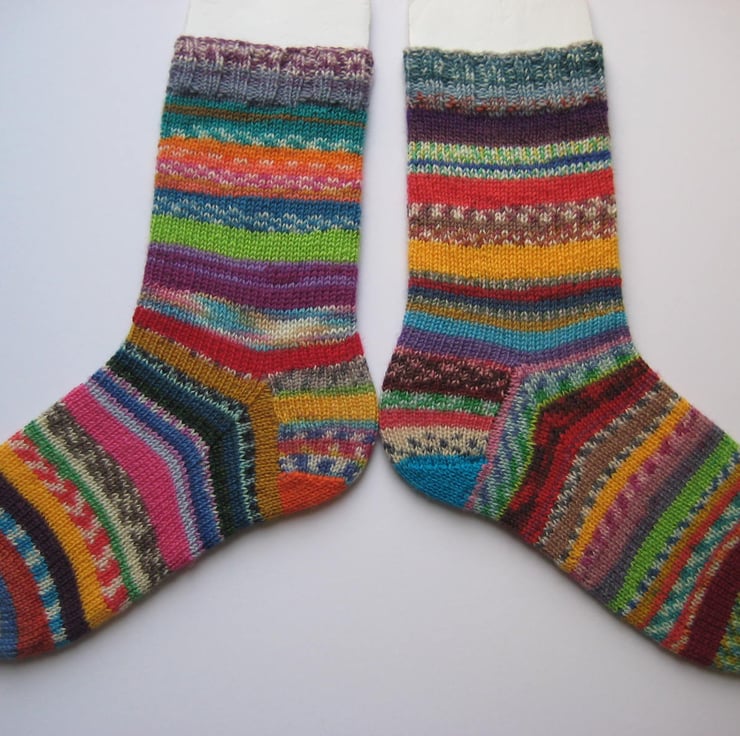 Hand knitted in the round on 5 double pointed needles, these scrappy wool socks are made from many different 4 ply self patterning sock yarns. Made from 75% wool 25% polyamide yarn, in just about every colour you can think of!