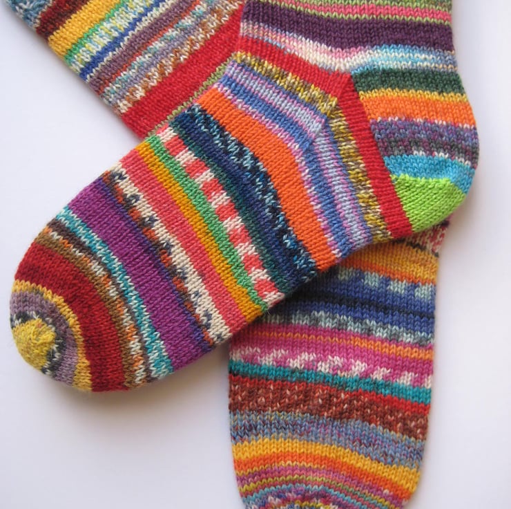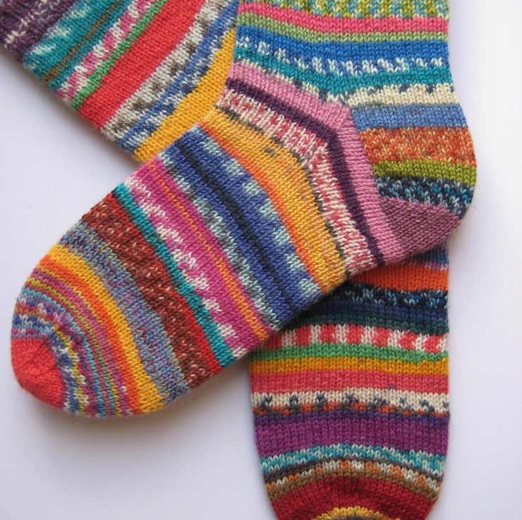 Made from very fine yarn, they are not very thick and will fit most footwear. Warm and durable, these socks will keep your feet comfortable and bright throughout the year. A truly unique pair of socks that will cheer up any feet!