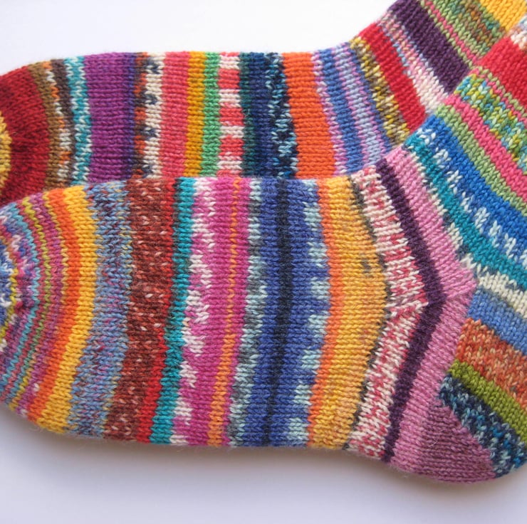 Hand knitted in the round on 5 double pointed needles, these scrappy wool socks are made from many different 4 ply self patterning sock yarns. Made from 75% wool 25% polyamide yarn, in just about every colour you can think of!