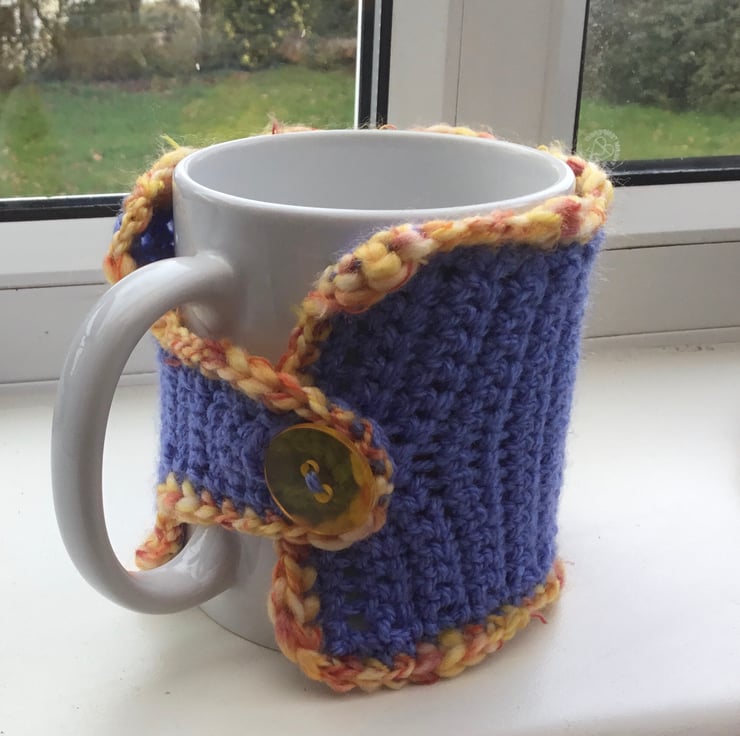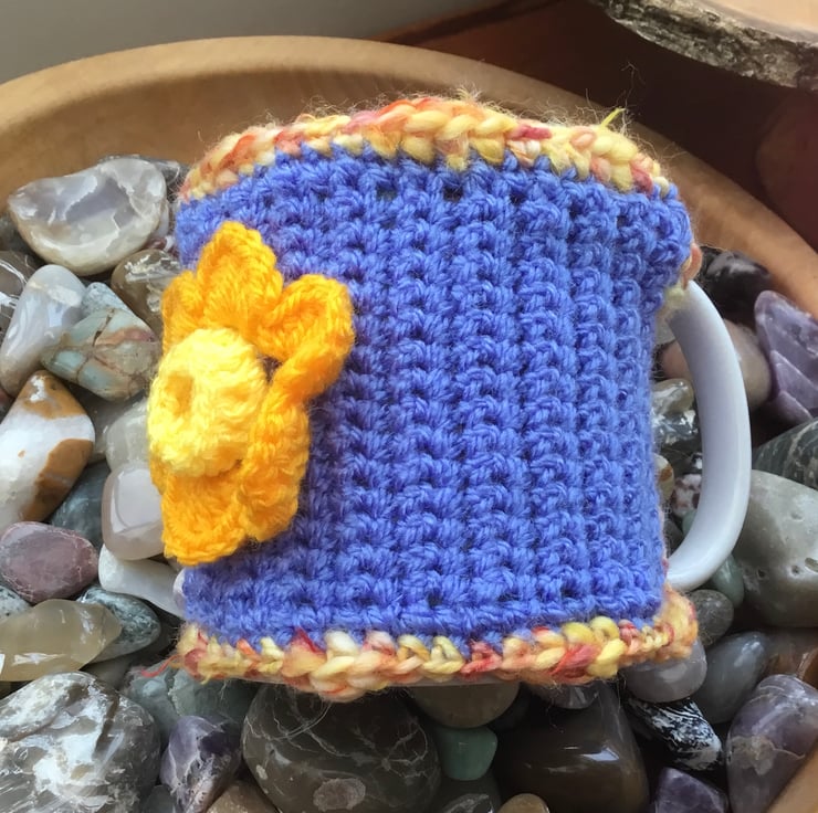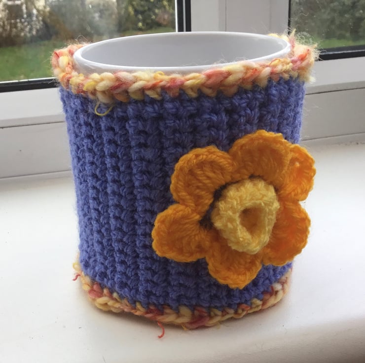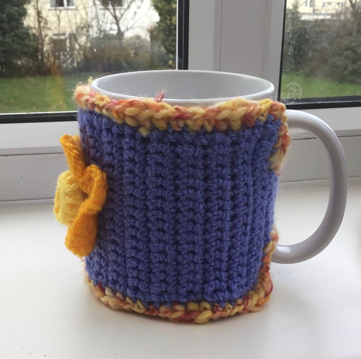 Spring Daffodil Mug Cosy, crocheted in a muted blue or mauve acrylic yarn and trimmed in variegated yellow orange yarn and featuring a crocheted golden yellow daffodil, inspired by looking forward to spring and fastened with yellow button.