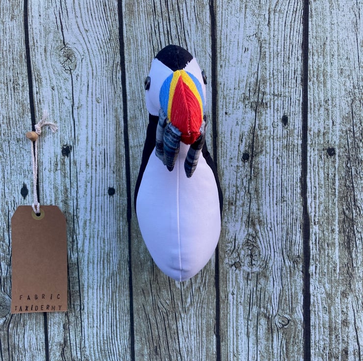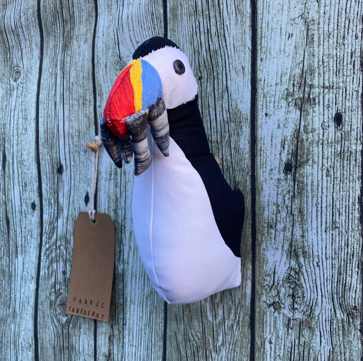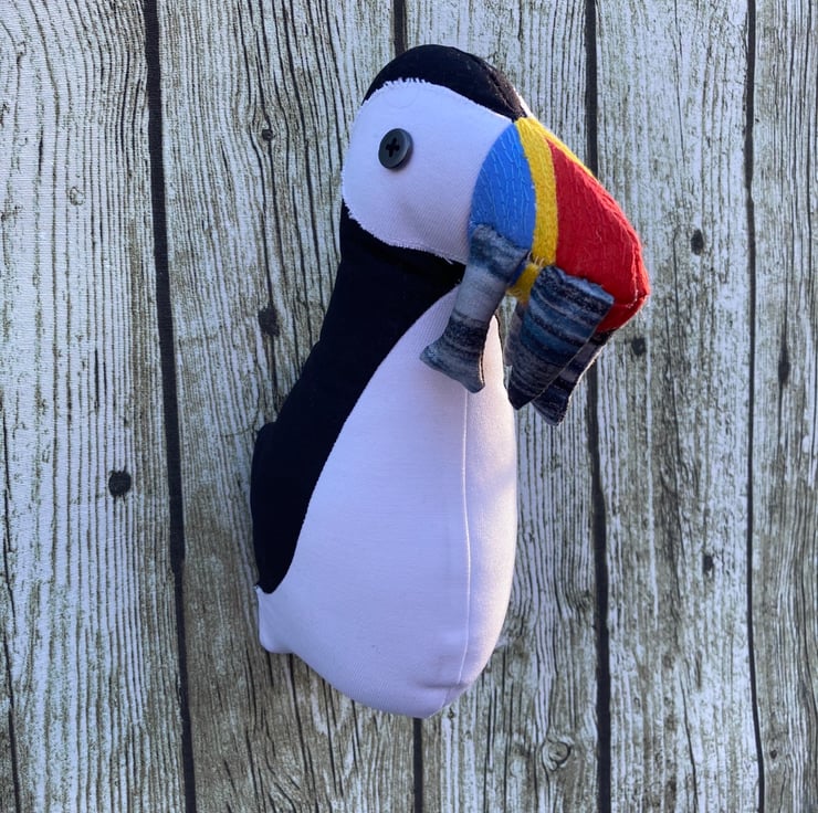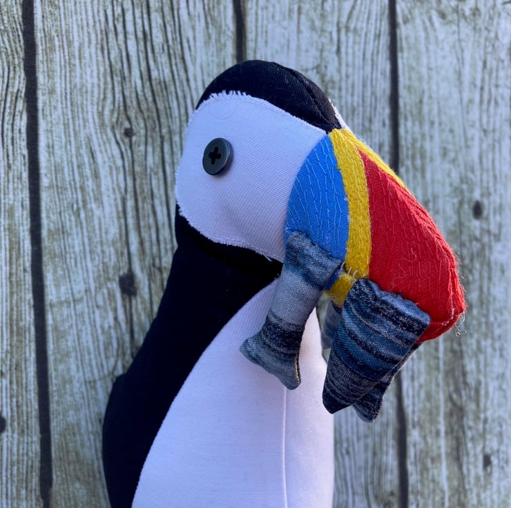 The Puffin is made with a selection of fabrics, his beak is hand painted, then free motion embroidered to give it the distinct colourful look. He is stuffed with 100% polyester hollowfibre stuffing (which complies with British fire safety regulations)