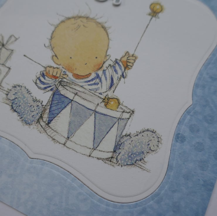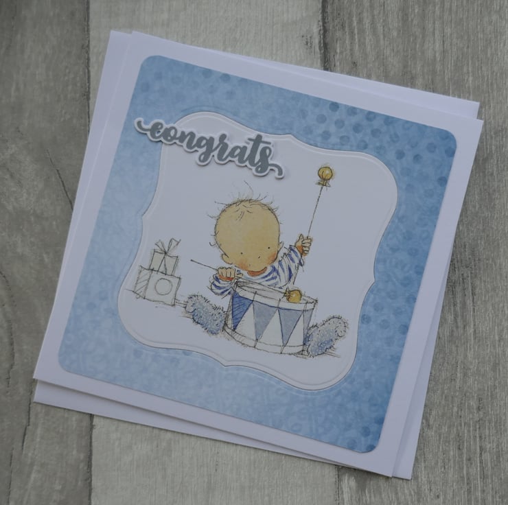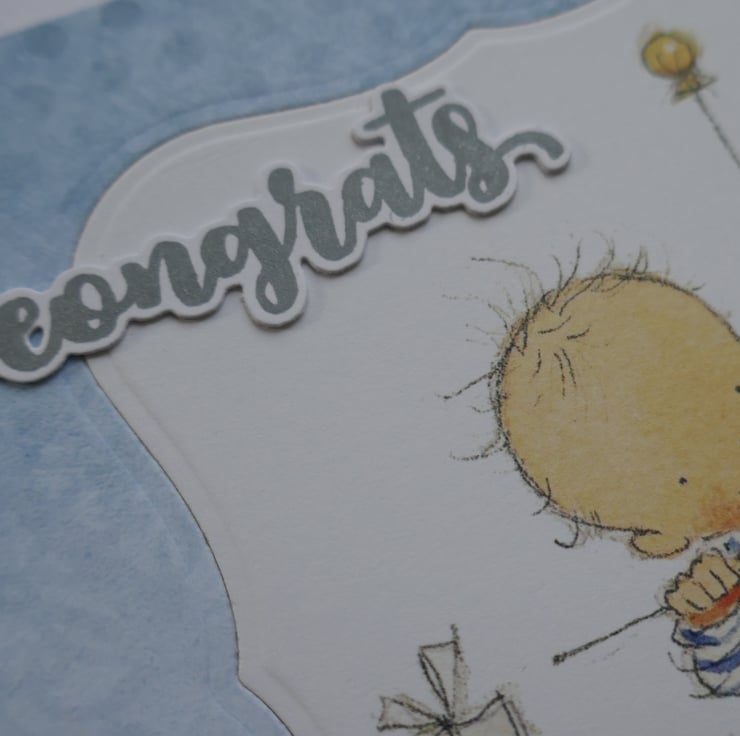 A piece of blue patterned paper has been attached to the card leaving a white border around the edge. A shaped aperture has been die cut from the front and the cute Lili of the Valley precoloured baby image has been inlaid into the aperture. 'congrats' has been stamped in grey ink, die cut and attached to the card.