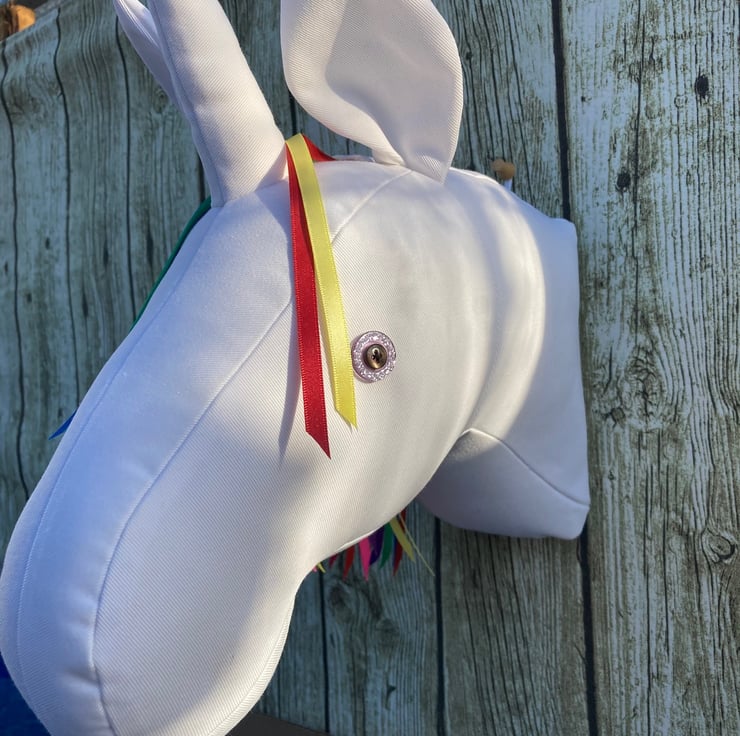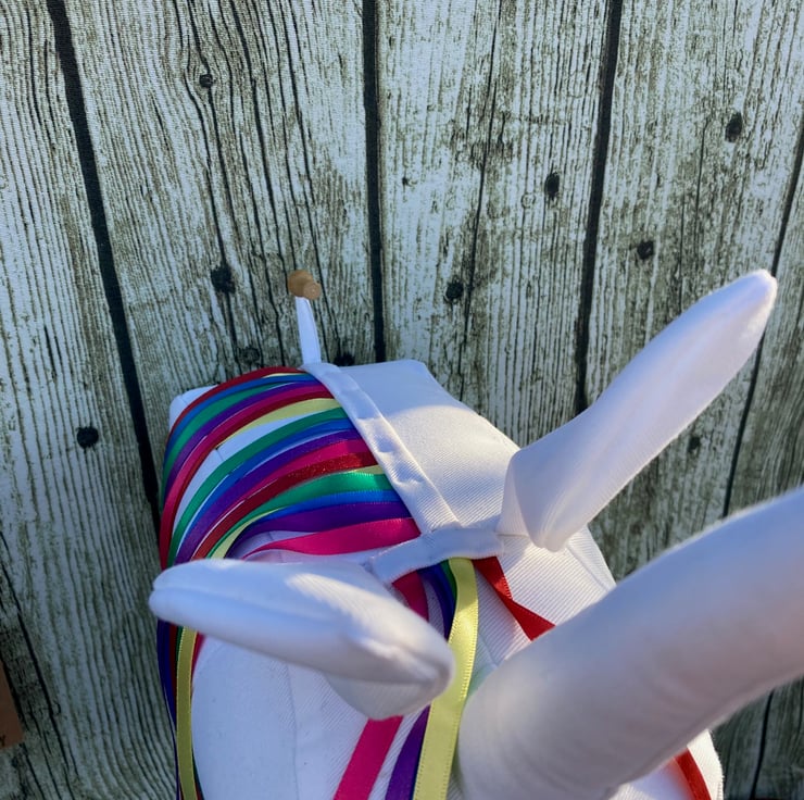 Made with white fabric and a rainbow ribbon mane, she is stuffed with 100% polyester hollowfibre stuffing (which complies with British fire safety regulations)