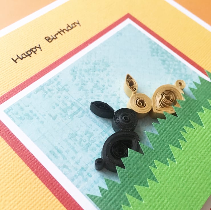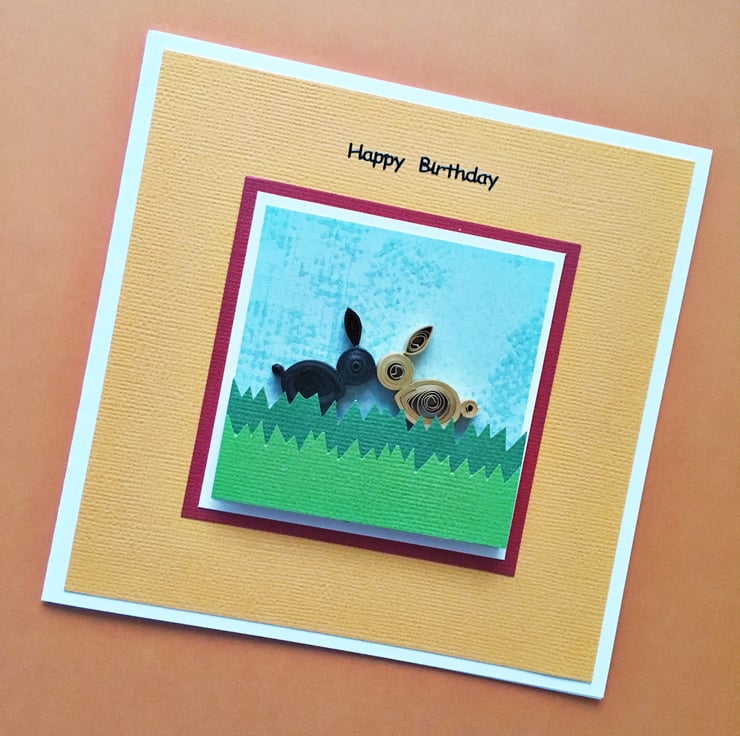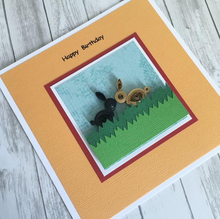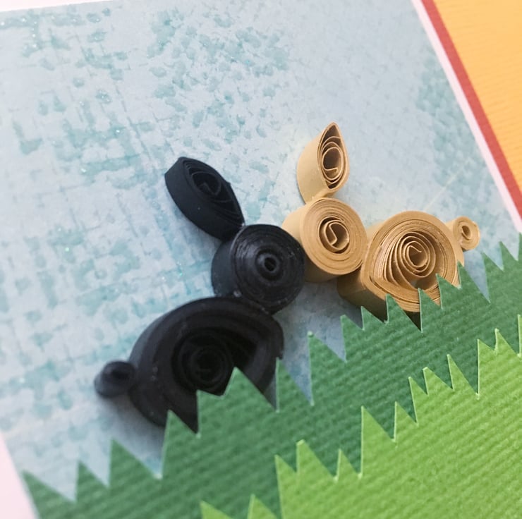 There are two hand-quilled rabbits – one black and one brown – nose to nose in the spirit of friendship.
