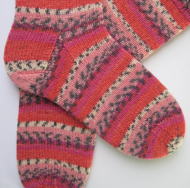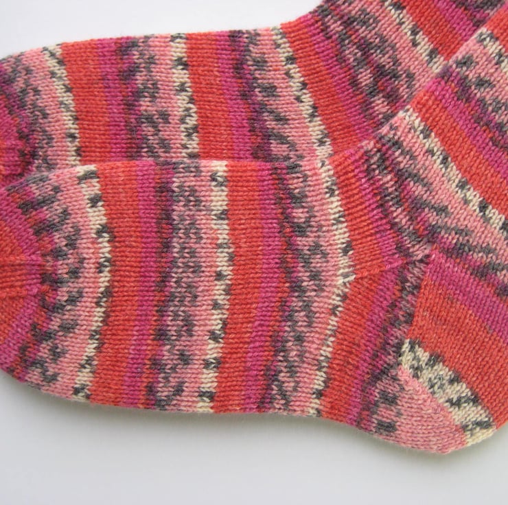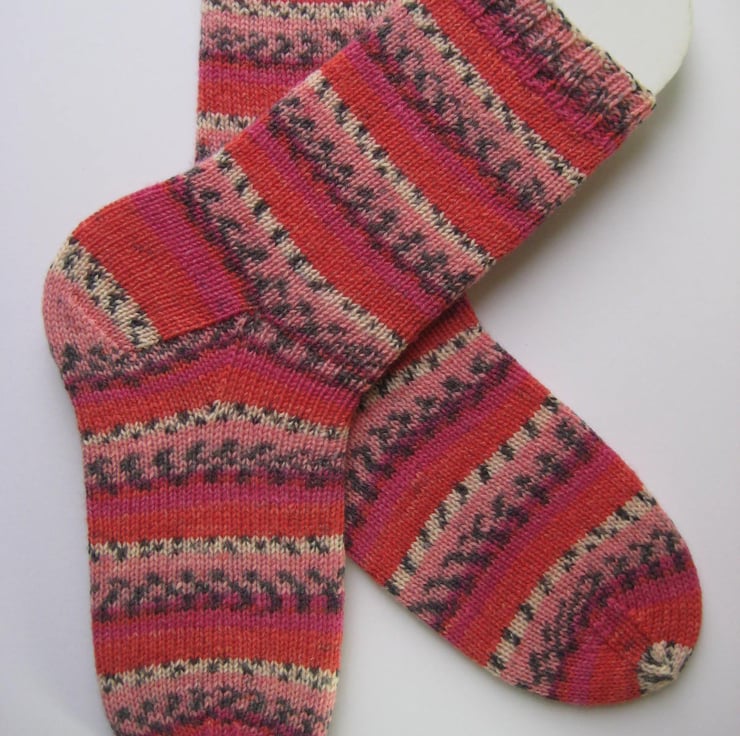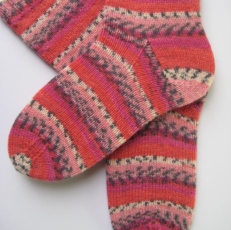 Hand knitted in the round on 5 double pointed needles (by me, not a machine), these wool socks are made from Opal 4 ply self patterning sock yarn. Made from 75% wool 25% polyamide yarn in shades of pink, grey and cream.