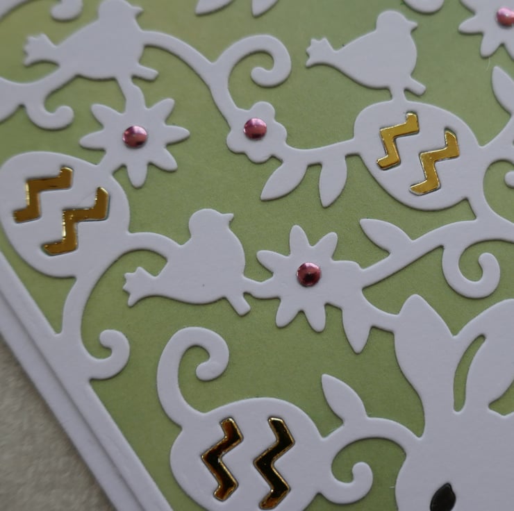 The Easter scene of a rabbit with Easter eggs, flowers and birds has been die cut from white matt card and layered over green watercolour card. The rabbit's eye has been inlaid with brown card and the zig zags on the Easter eggs have been inlaid with gold mirri card. Small pink enamel dots have been attached to the centre of the flowers.
