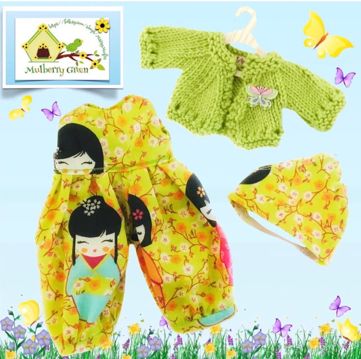 A pretty little cropped cardigan in pistachio green to fit the Mulberry Green characters. The cardigan is hand knitted and is decorated with a little butterfly. It comes on a cute little wooden hanger and matches the cherry blossom play suit.