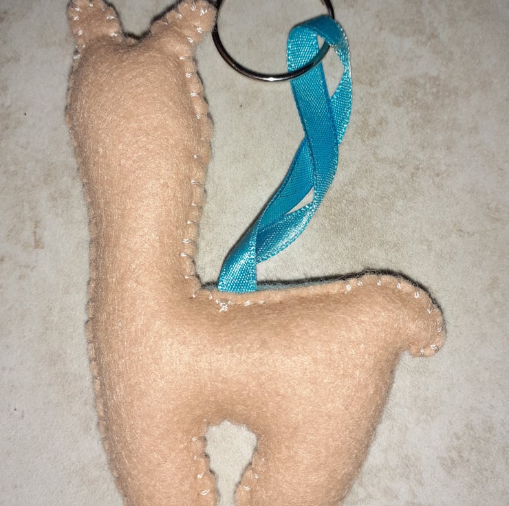Handmade felt alpaca keyring. Light brown alpaca with a mid brown face, black facial details and a pale blue blanket with blue and pink embroidery. Approx. 10 cm x 6.5 cm. Blue ribbon sewn in to silver key ring.