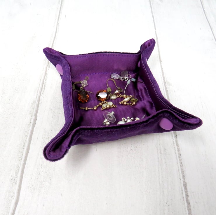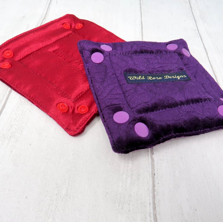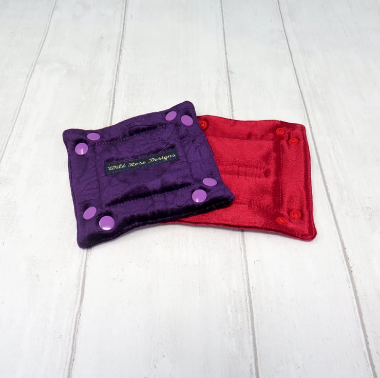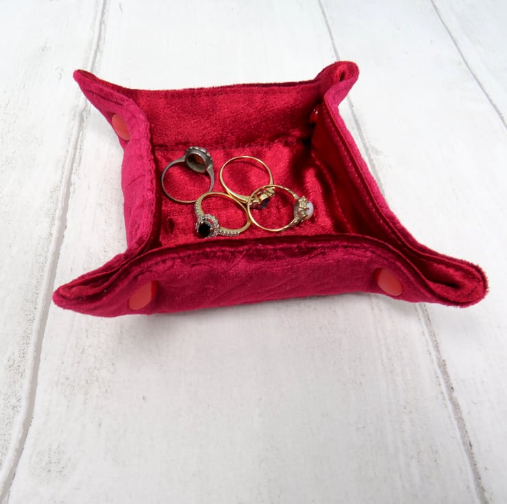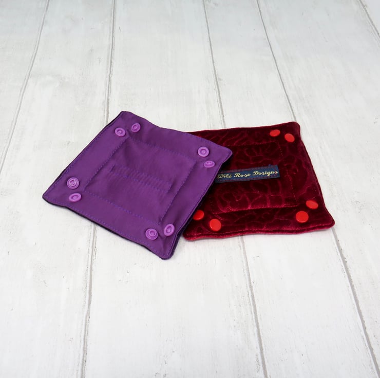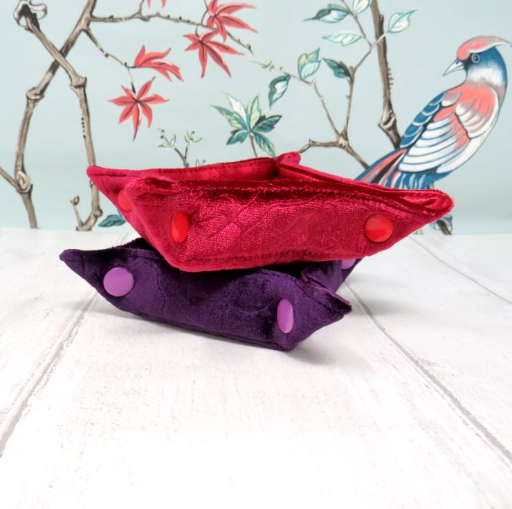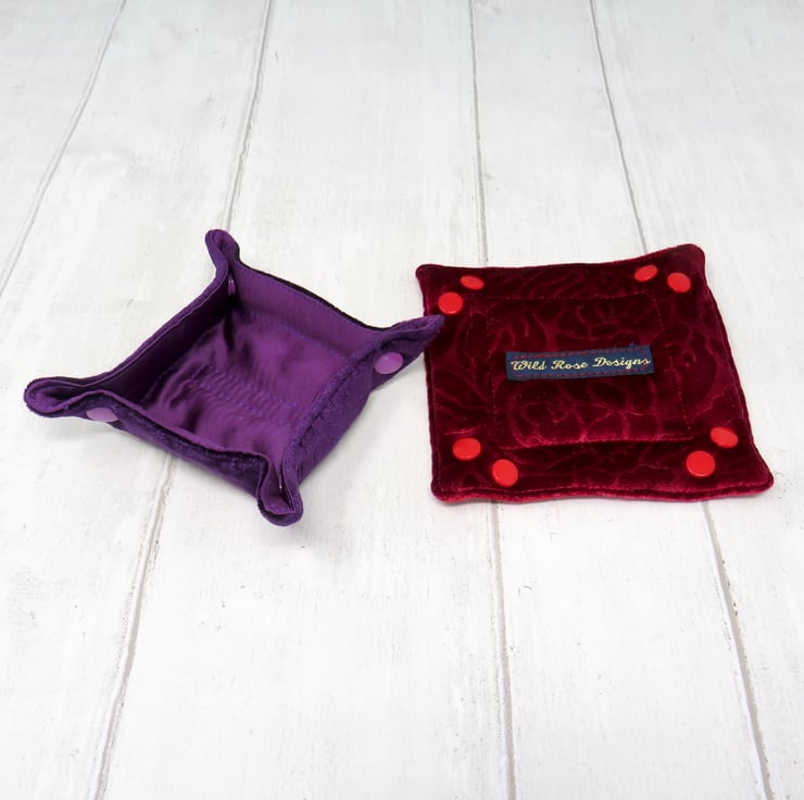 A pair of richly coloured velvet ring storage trays, one purple and the other red. They are perfect for storing small items of jewellery such as rings and earrings. The soft velvet has a pattern embossed on the surface adding interest and reflecting the light. They are lined in satin and are lightly padded for structure and to protect the contents. They are easily assembled using the snaps positioned in the corners and lay flat for storage, making them great for travel.