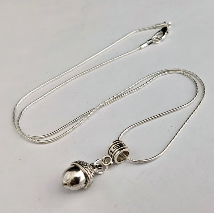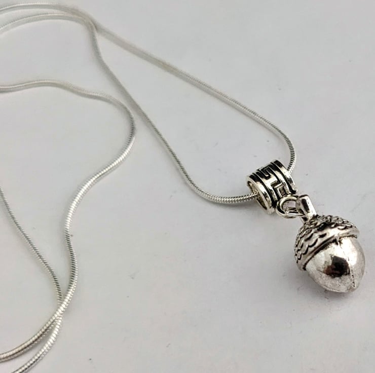 15mm 3D Tibetan silver acorn pendant on 18" silver tone snake chain. In an organza gift bag.