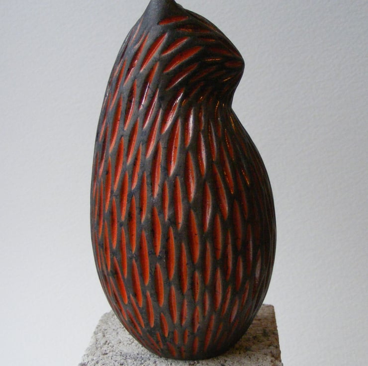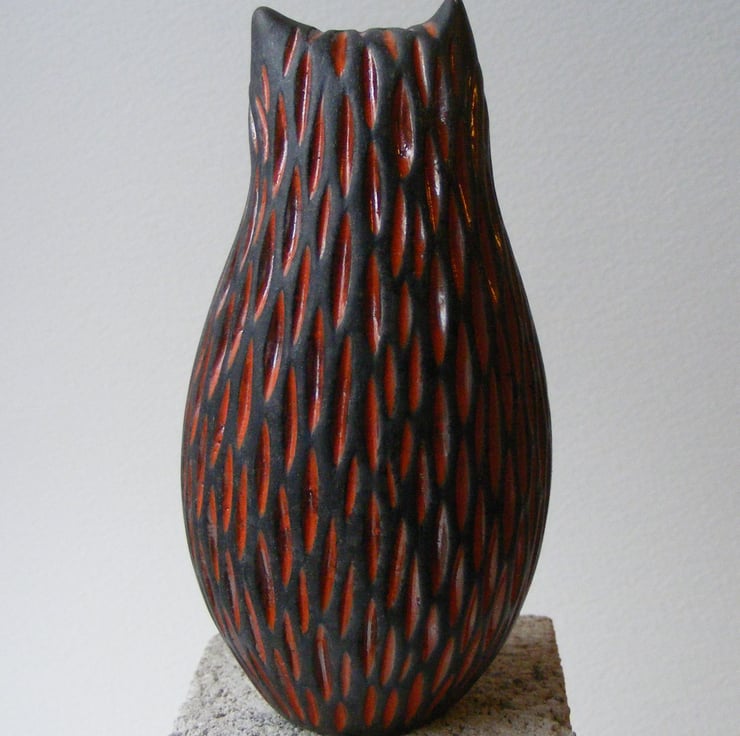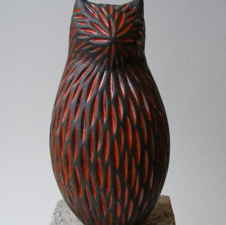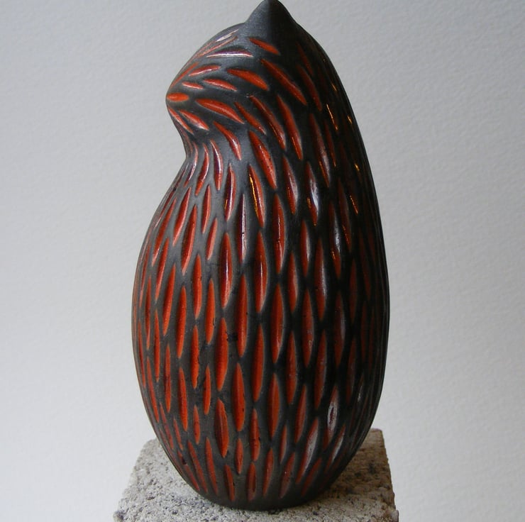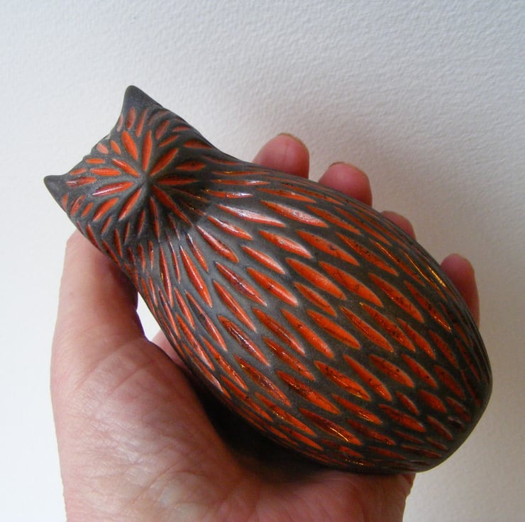 This cat is hand made and measures 11cm high and 5.5cm wide. It is made from white earthenware clay and carved before being fired in an electric kiln, I then paint on 4 layers of raku glaze, which when dry is wiped back leaving the glaze only in the carved indents, it is then fired again in a gas kiln, then at a 1,000 degrees it is taken out and smoked in a container with sawdust, this makes any unglazed part of the bird a black/grey colour. It has been polished with bees wax.