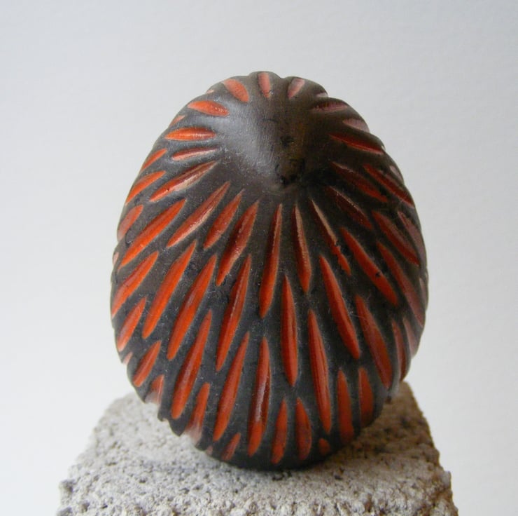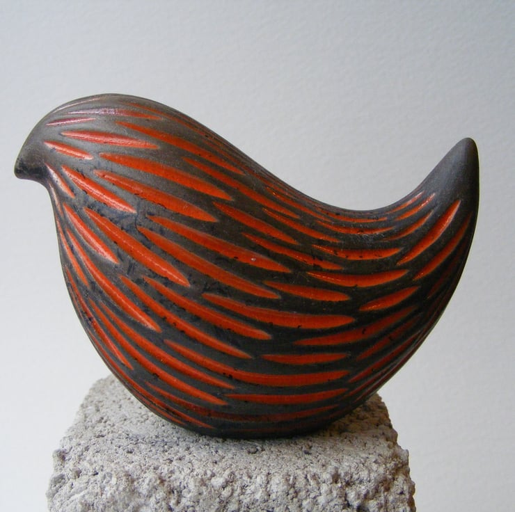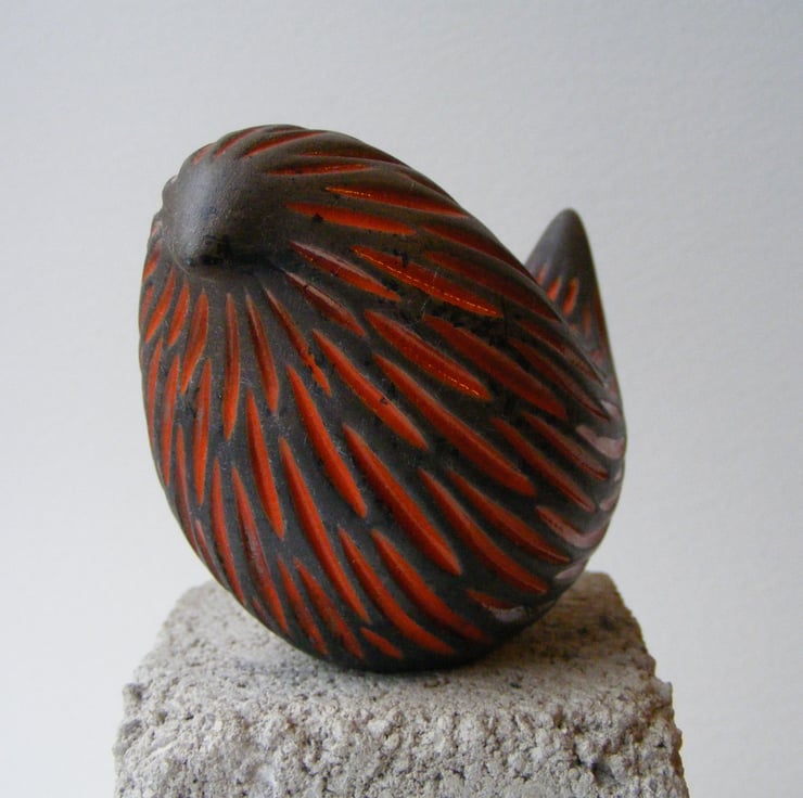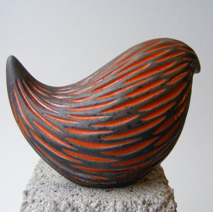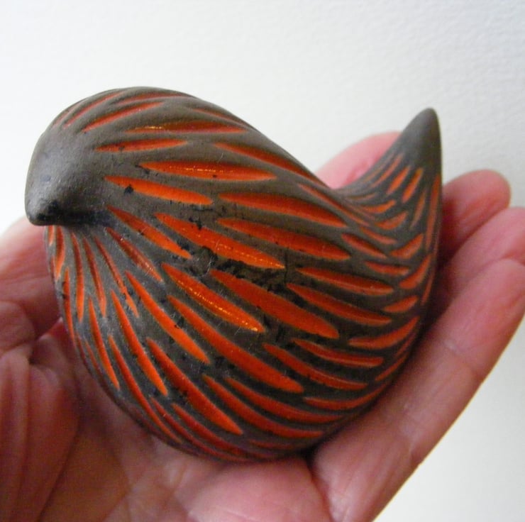 This little bird measures approx 6cm high, 9cm long and 4.5cm wide. To make it I first modelled the shape then made a mould from it. I then cast it with white earthenware clay, when it is leather hard I carved out the feather marks, dry it and then fire it to 1060 degrees in an electric kiln. I then fill the indents with orange raku glaze and fire it again in a gas kiln, then I smoke it in sawdust in a lidded container, the unglazed parts are turned a black/grey colour, it is then polished with bees wax.