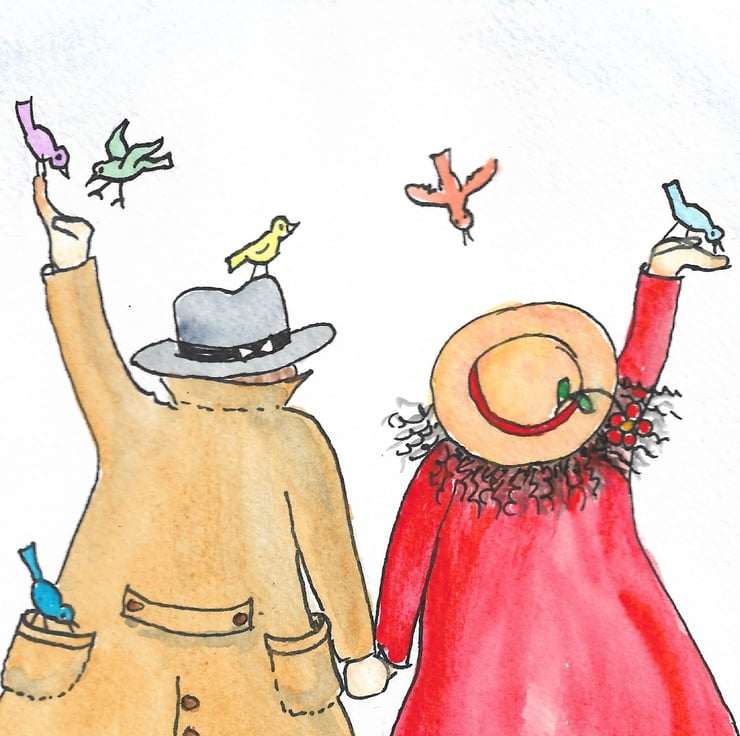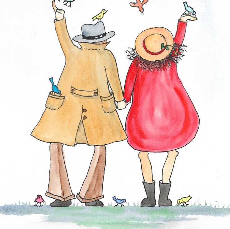Two people enjoying giving the birds some seeds. Loving couple feeding the Birds.