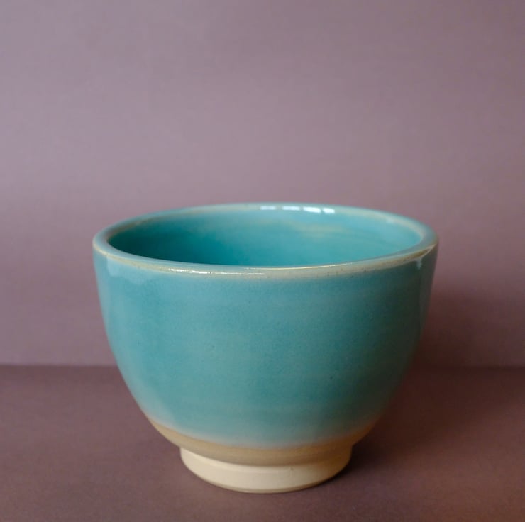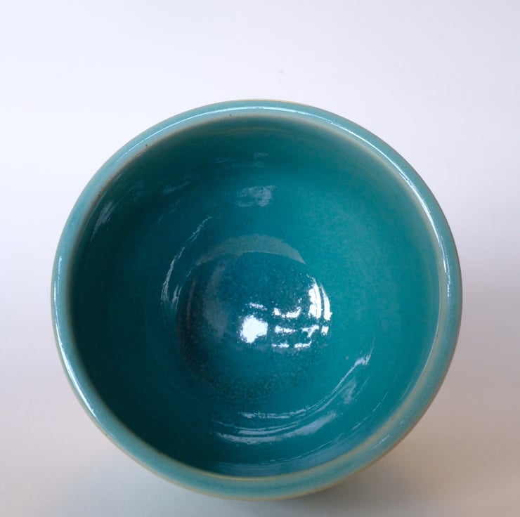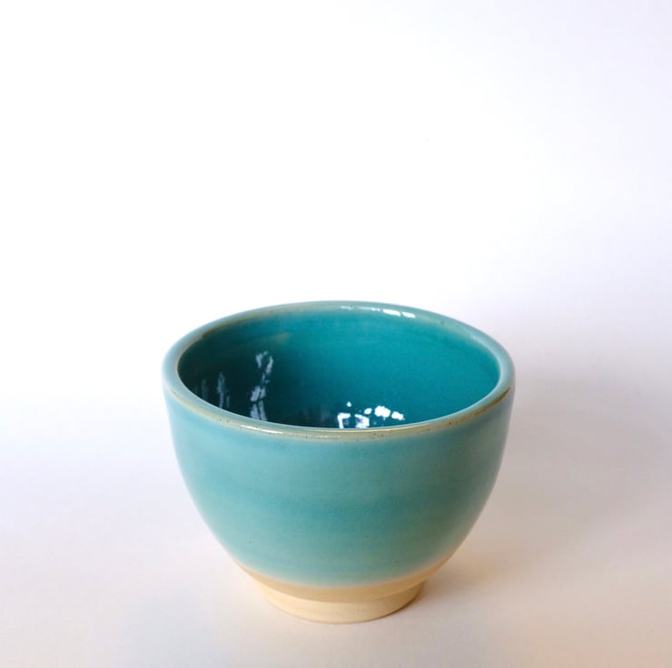 Small handthrown pot glazed with turquoise. Height: 7cm. Opening diameter: 8.7cm.
