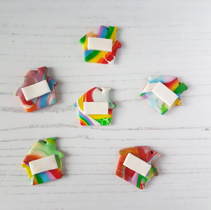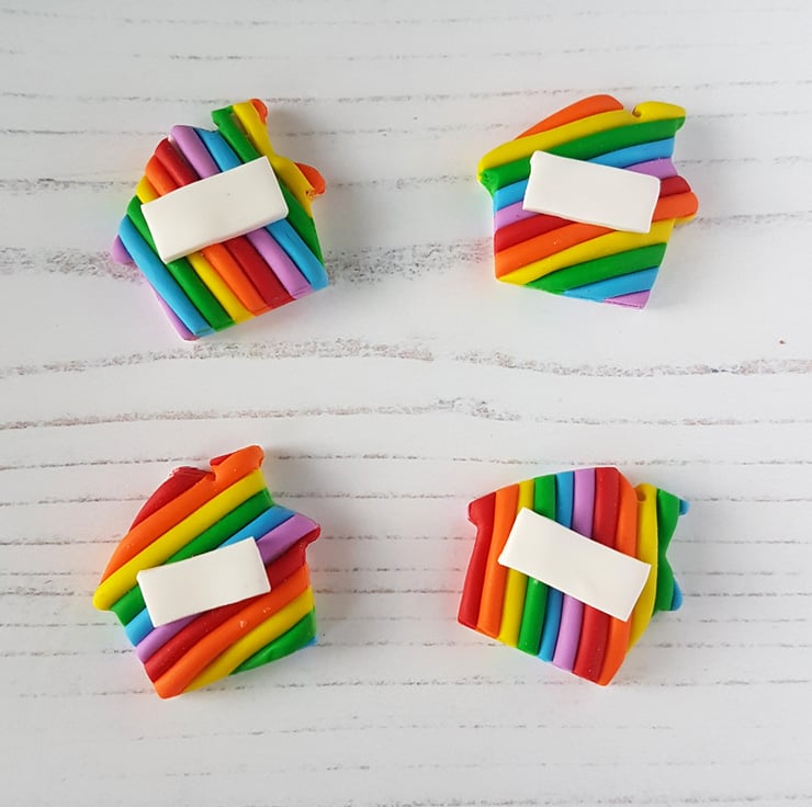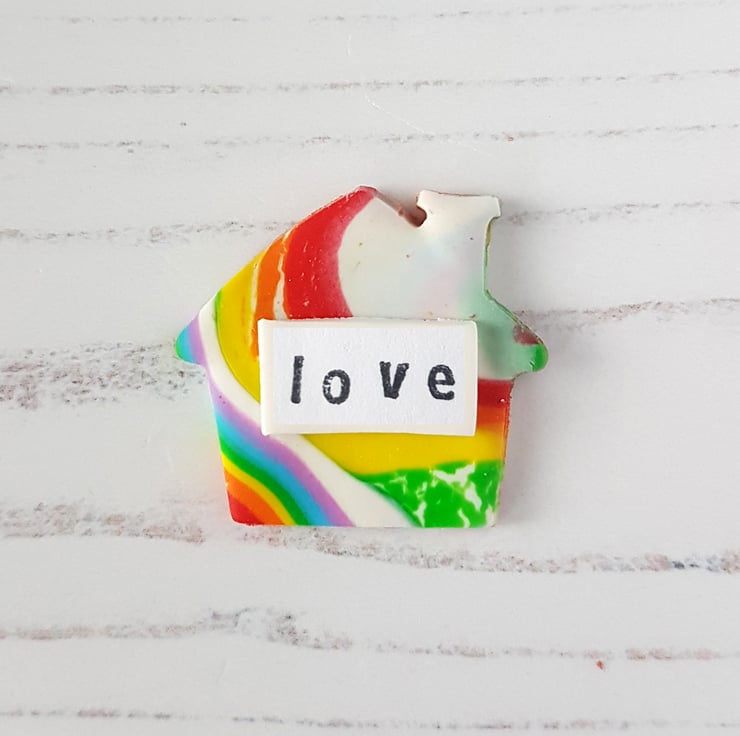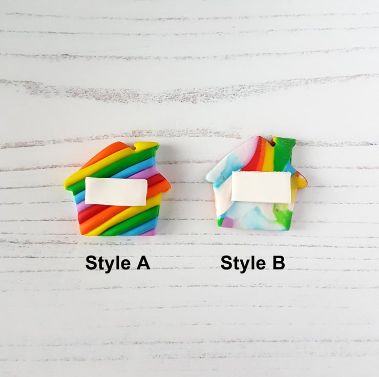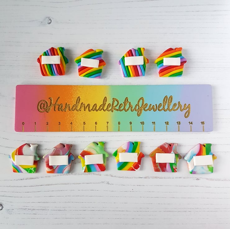 Following on from my first design with a bird and balloon, this new design is in the shape of a mini house, using rainbow colours of polymer clay for two different styles of pattern. A white rectangle of clay is placed on top of this, for me to hand stamp a word of your choice, using permanent ink. Popular words might be HUGS, LOVE or MUM, DAD etc. Please note, the word must be 4 or 5 letters MAX, and no numbers.