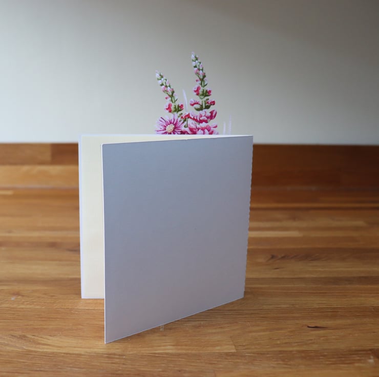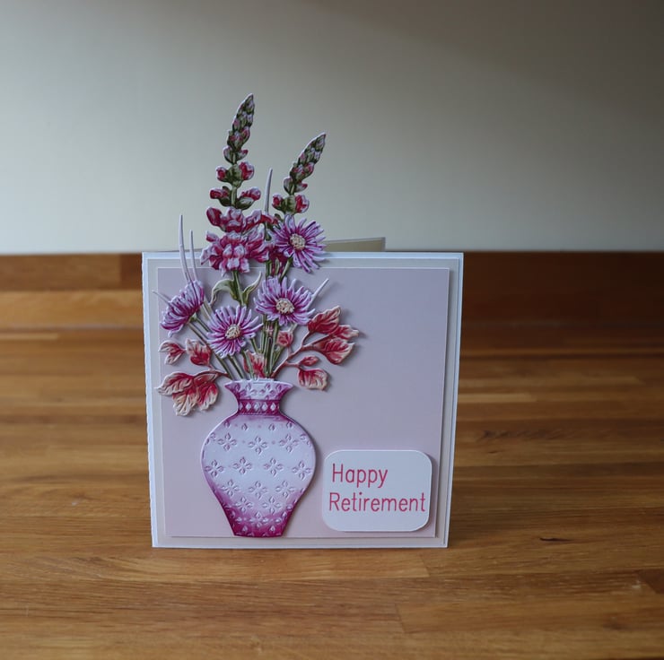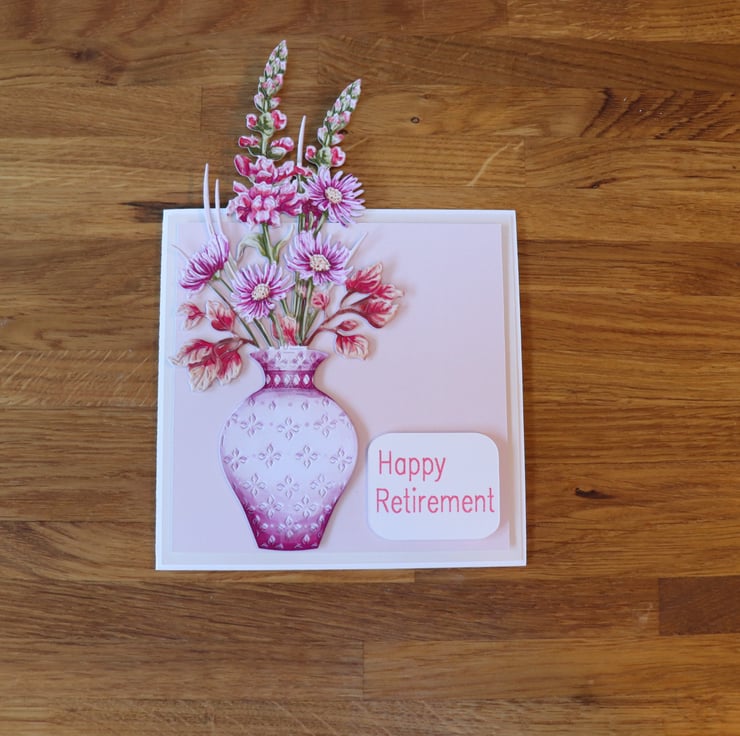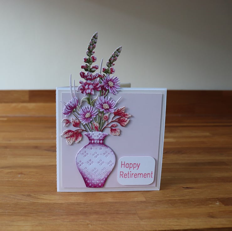 The sentiment is written in rose pink, and next to it is a vase and flowers that bloom over the top of the card.