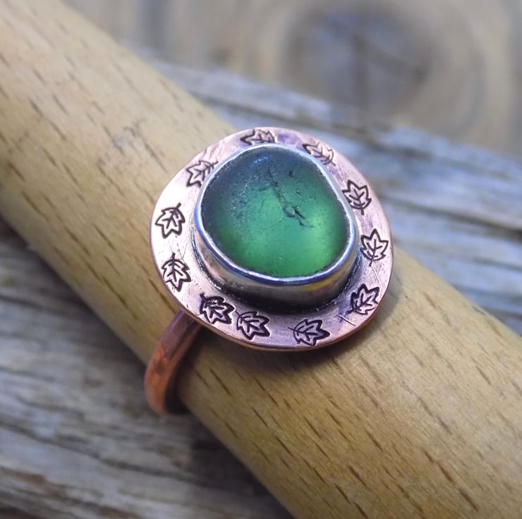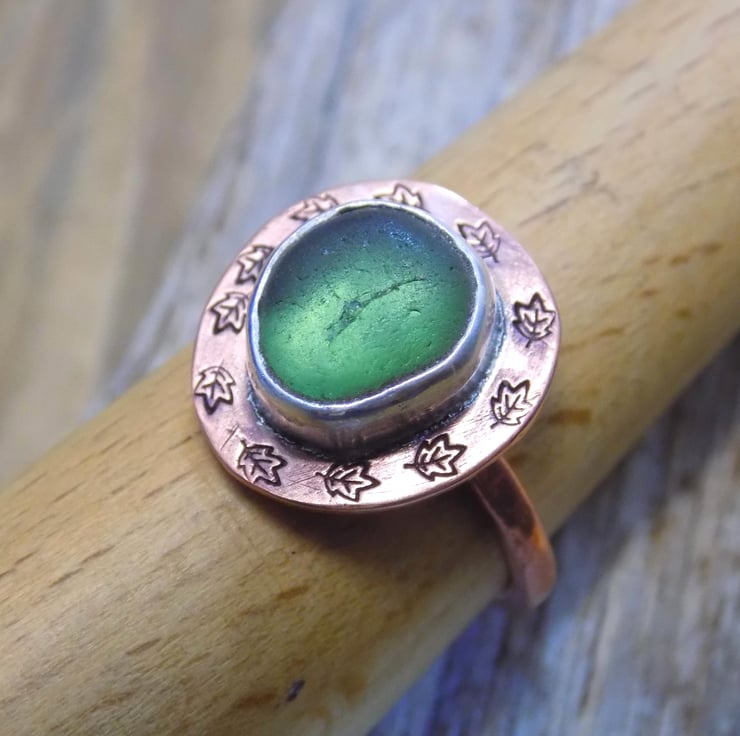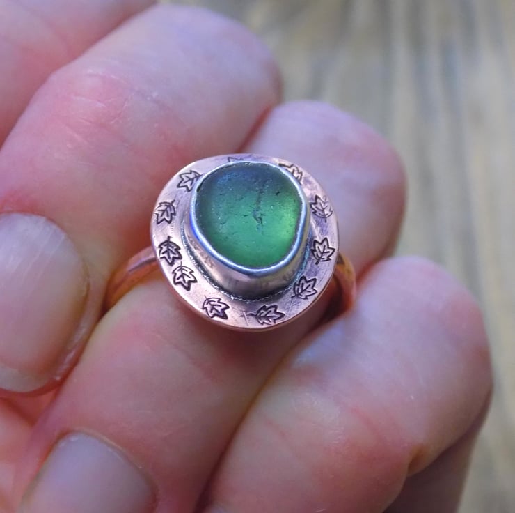 A unique and distinctive ring made from copper and silver. A lovely green piece of sea glass has been set in silver, backed with copper and sits atop a 2mm thick copper band. Its been given a slightly aged look which picks out the tiny stamped leaves around the edge of the ring. It slightly resembles a medieval jewelled ring but with sea glass !