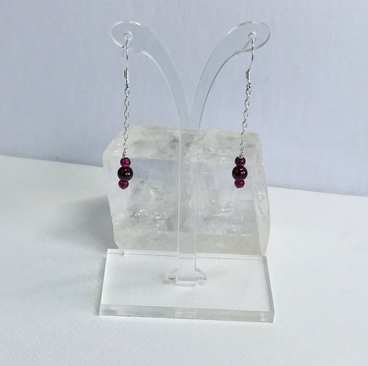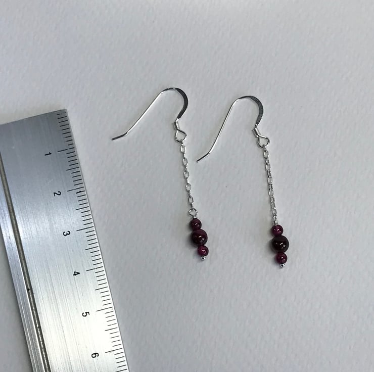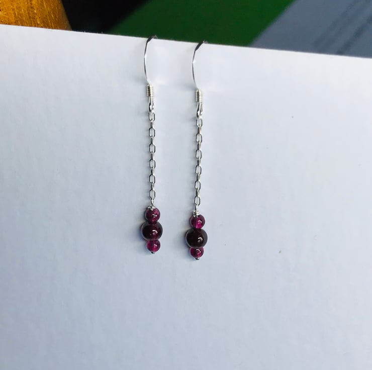 Sweet little earrings consisting of a section of sterling silver diamond cut, square edge fine chain, onto which I have wire wrapped natural garnet beads.
