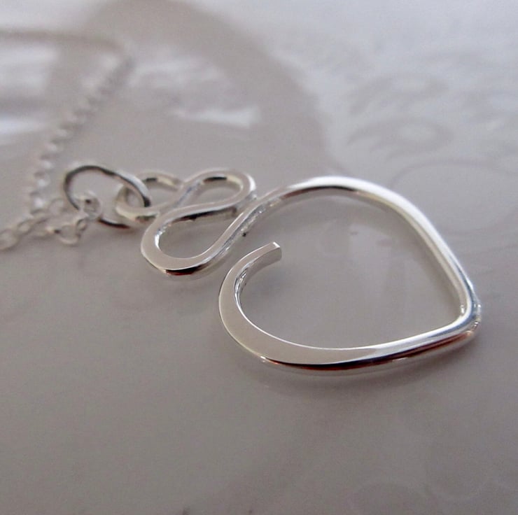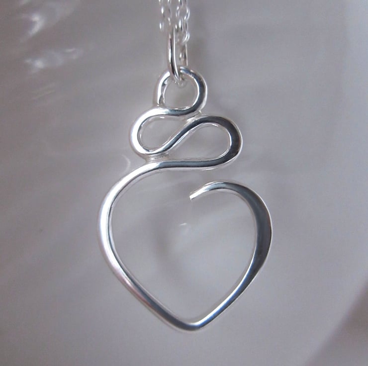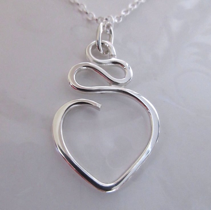 This playful squiggly heart pendant has been hand forged from a single piece of sterling silver, carefully shaped to form undulating curves before ending in an open heart form. A stylish, modern piece of jewellery for every day wear.