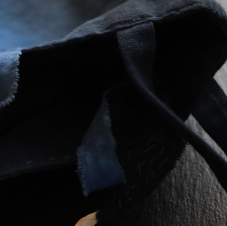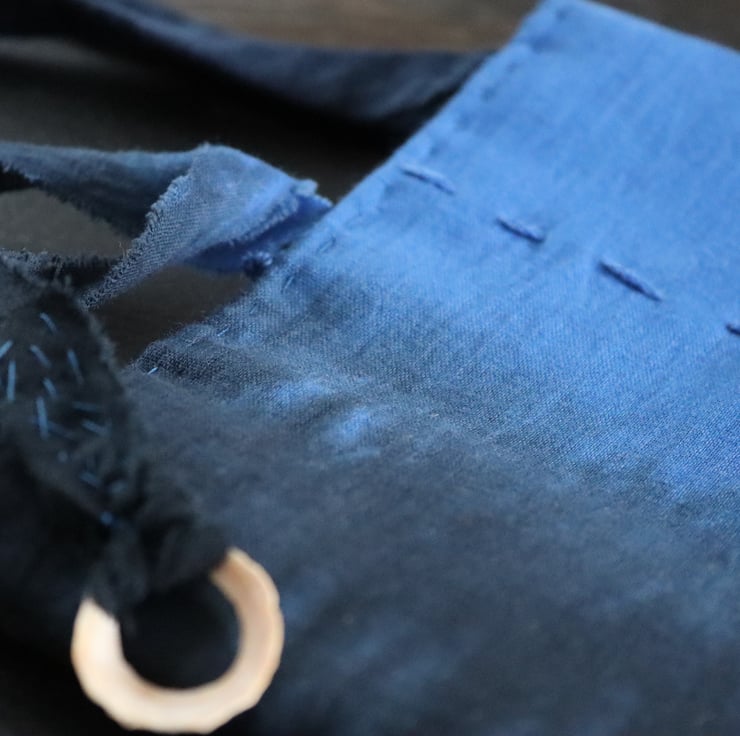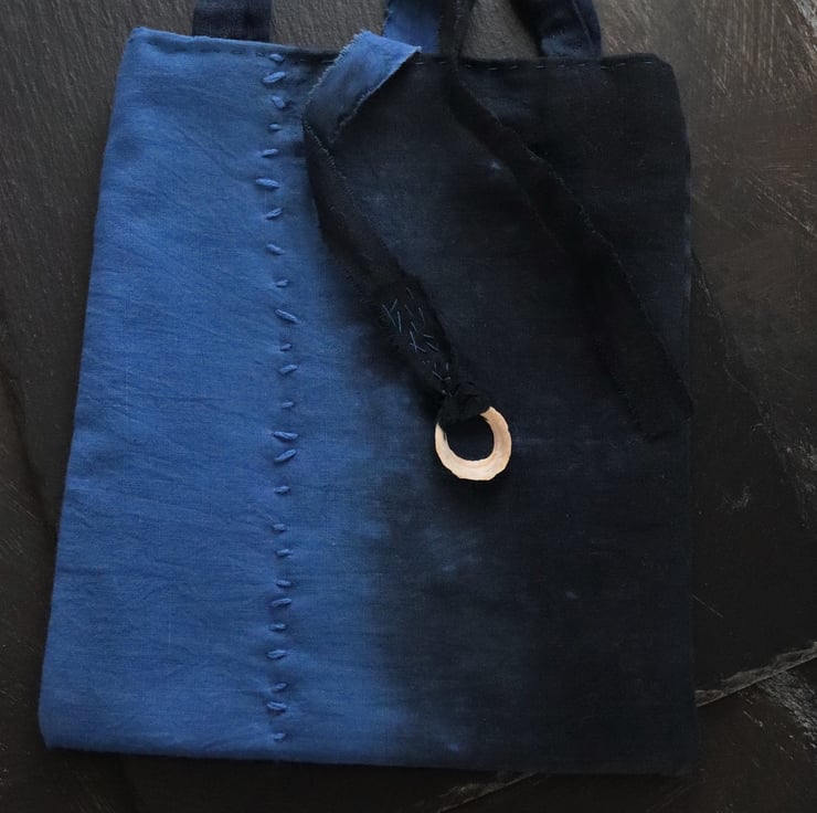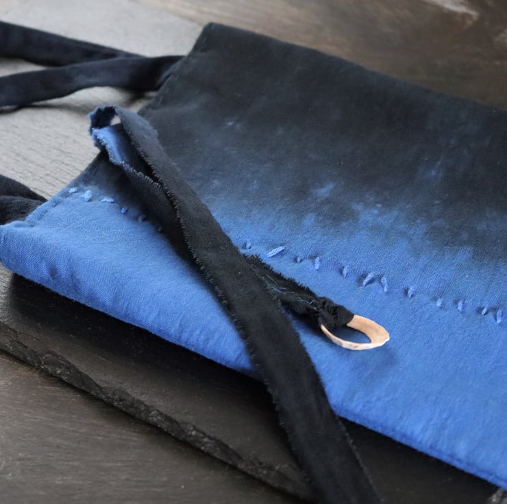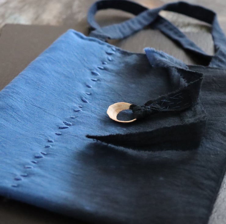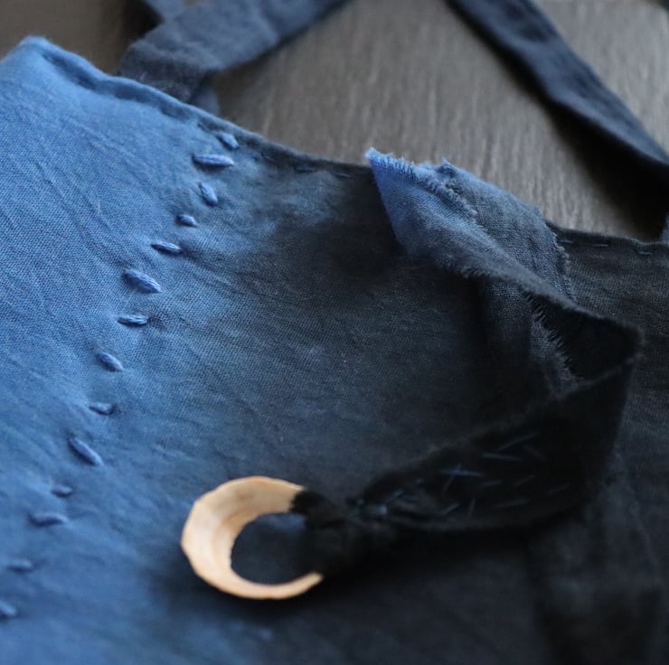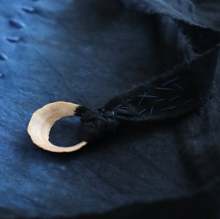 made with moroccan indigo dyed cotton fabric and a sea worn shell from the shore, with dark blue linen straps and lining.