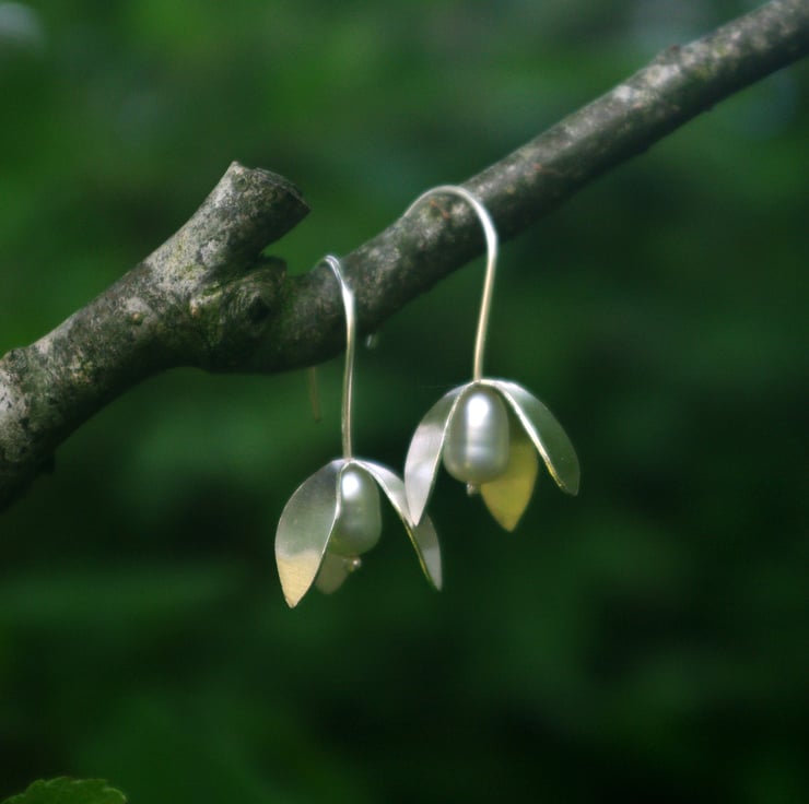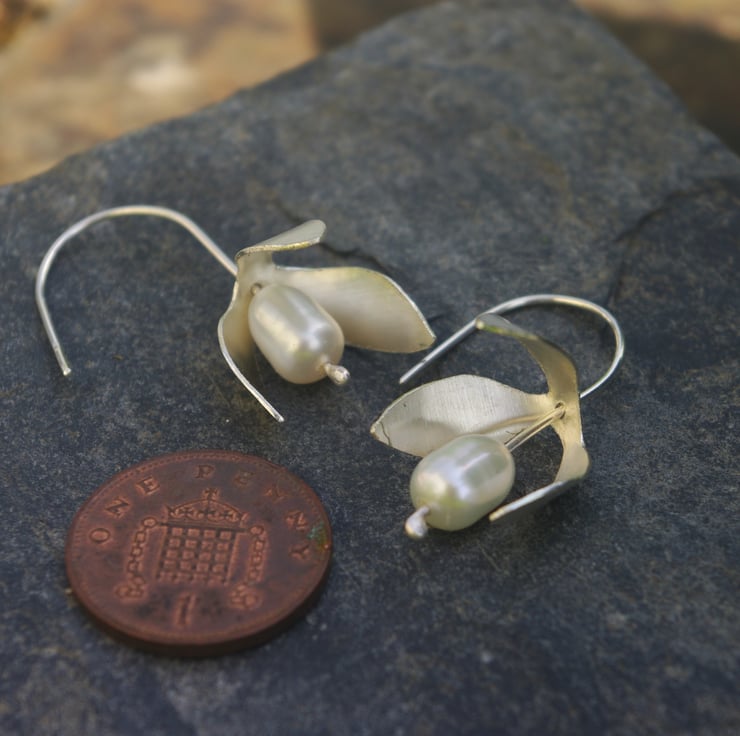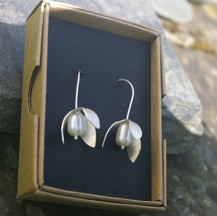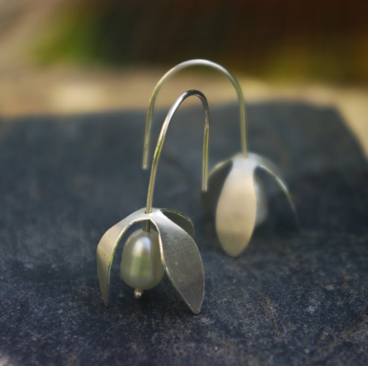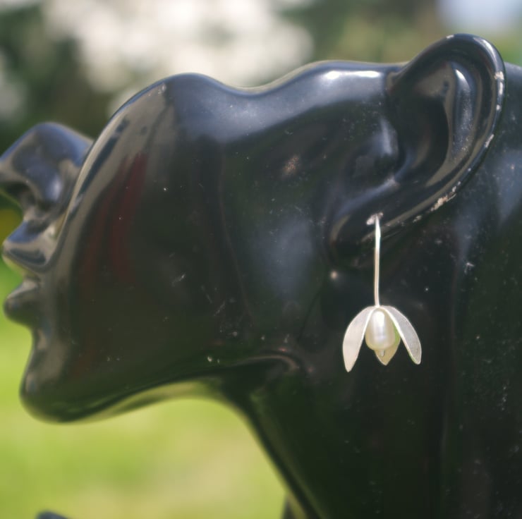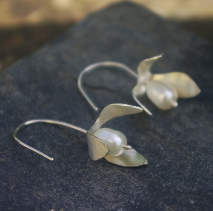 Inspired by the flower petals of a snowdrop, I have made silver flower earrings with a freshwater pearl. The silver flower shape is hand cut from a piece of eco sterling silver sheet and hangs from a silver handmade ear hook also made with eco silver. The end of the wire forms the middle of the flower with a large 9mm freshwater pearl as the centre.