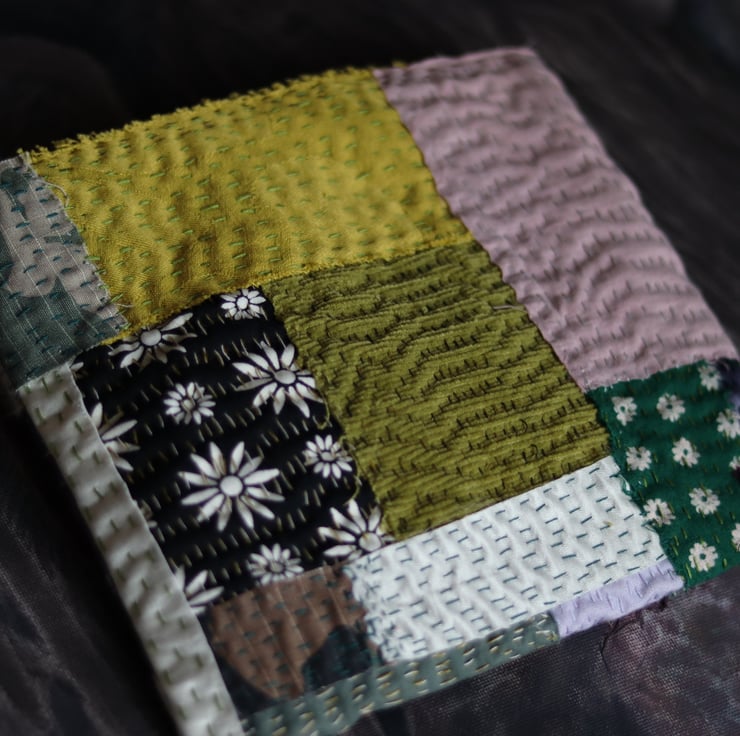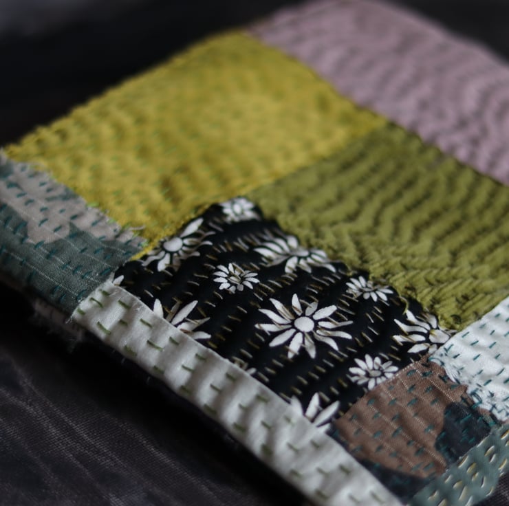 a slow stitched pouch made from little scraps of pre-loved fabrics, gathered into a new piece of cloth. lined with a black linen. closes with a vintage metal zip.