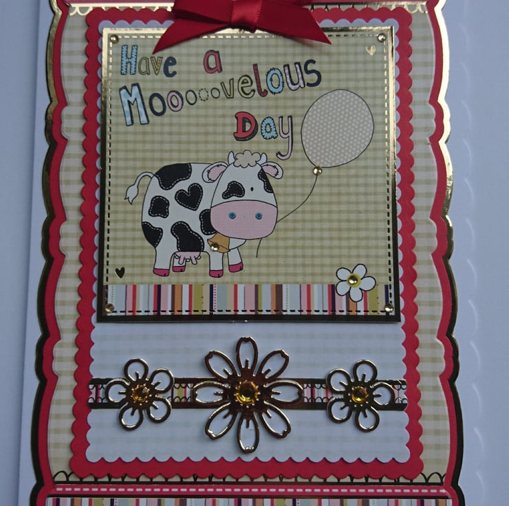 The design is a Fresian cow holding a helium filled balloon. She is wearing a cowbell around her neck - can you hear it? The sentiment says "Have a Mooooovelous Day".