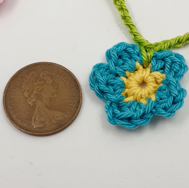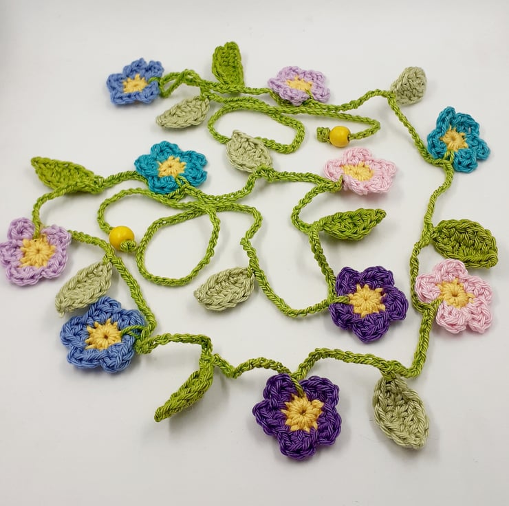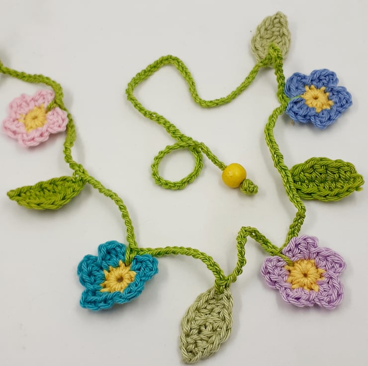 This mini garland is crocheted in cotton with a wooden bead at each end for easy tying. The flowers have a yellow centre and petals in one of five pretty colours. Each flower measures approximately 3 cm in diameter. The leaves alternate in two shades of green. The whole garland measures approximately 154 cm in length and comes wrapped in tissue in a labelled PIP ( Postage in Proportion) box all ready to be given or posted on if required.