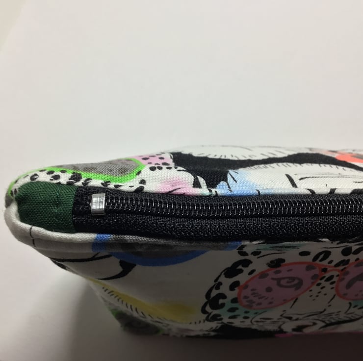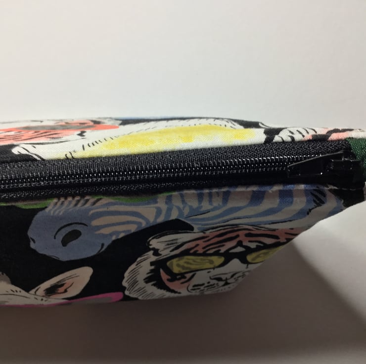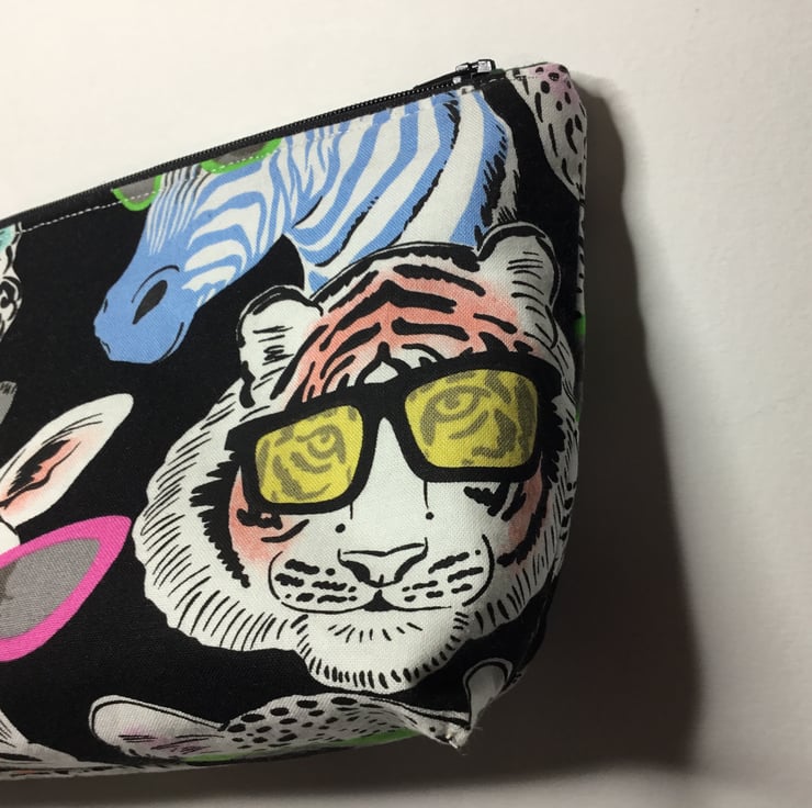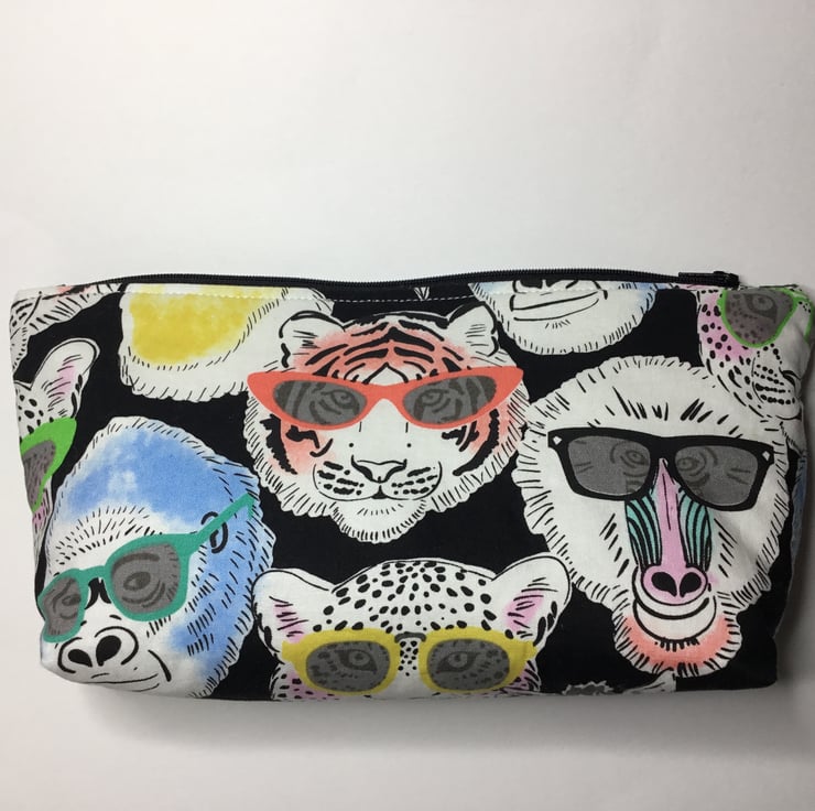 A larger size bag made from Alexander Henry fabric with tigers, monkeys, gorillas and zebras sporting colourful sunglasses! The lining I have used is a waterproof PUL food safe fabric. Useful as a make up bag, wet bag, toiletries, large pencil case, or snack bag. measures approximately 10.5” wide x 7” tall