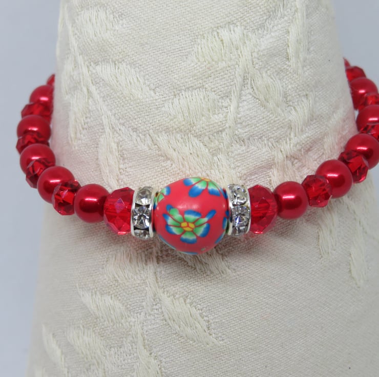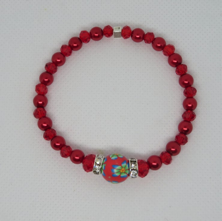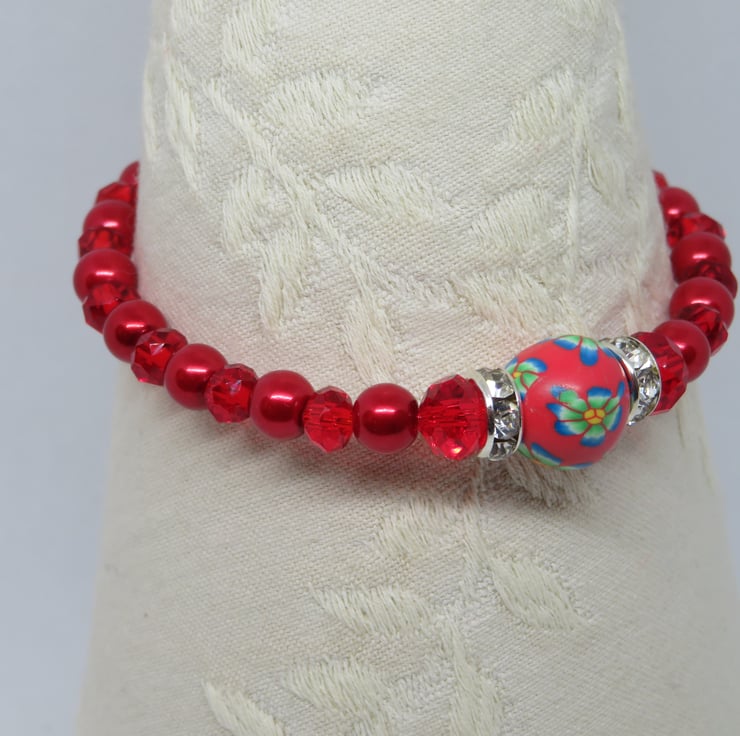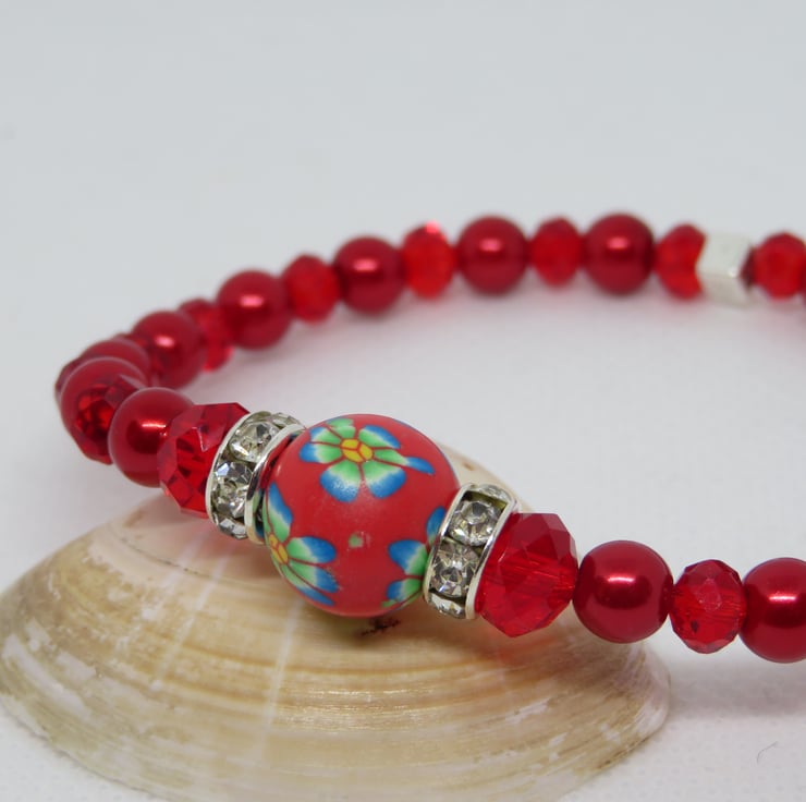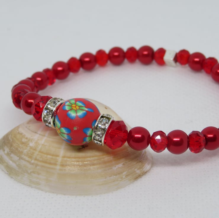 A single red 12mm polymer clay bead is the main focus of this stretchy bracelet. It's surrounded on both sides by diamante spacers, red crystal rondelles, red glass pearls and a single metal cube bead. The beads are securely strung on jeweller's elastic and the bracelet measures 6.5 inches in circumference. If you are unsure of the sizing, please contact me and I can make to your exact requirements.