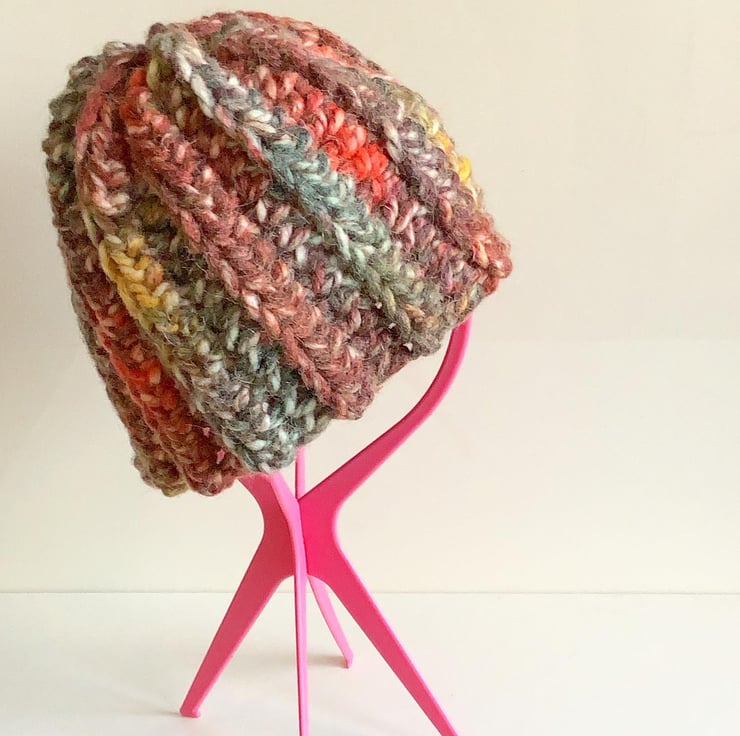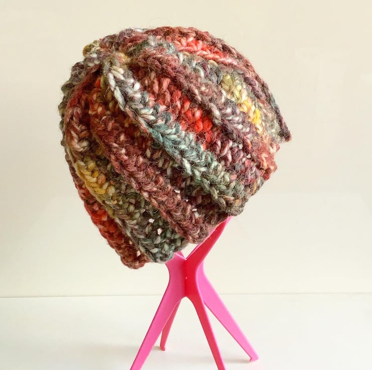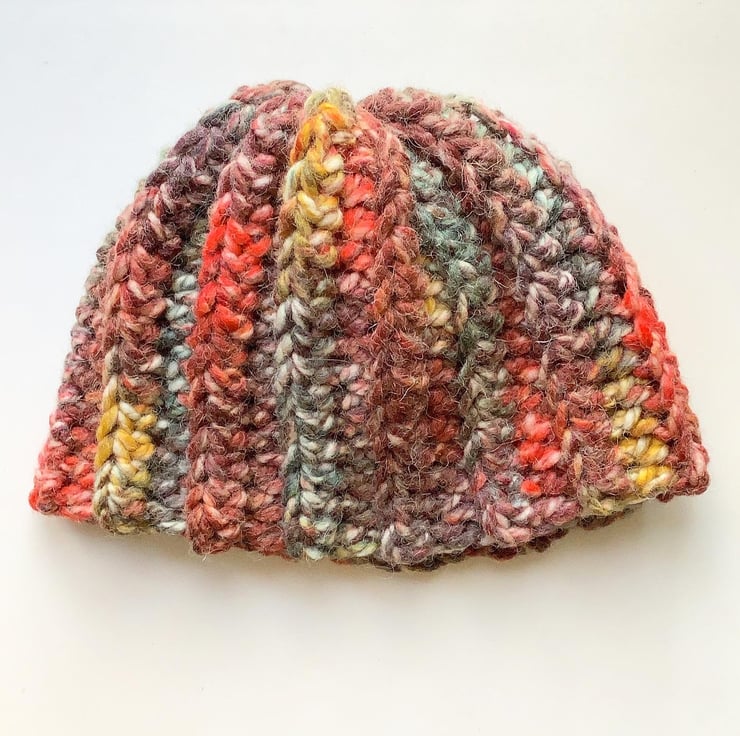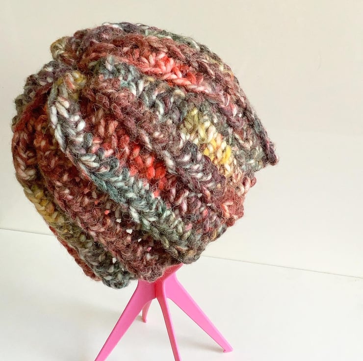 The perfect hat crocheted in super chunky yarn. The colour changing yarn is in shades of brown, green, orange and yellow.There is a cream fleck running through it to give it a marled effect.