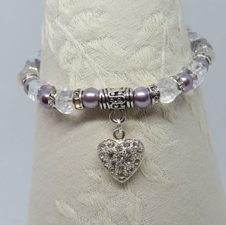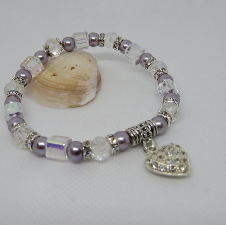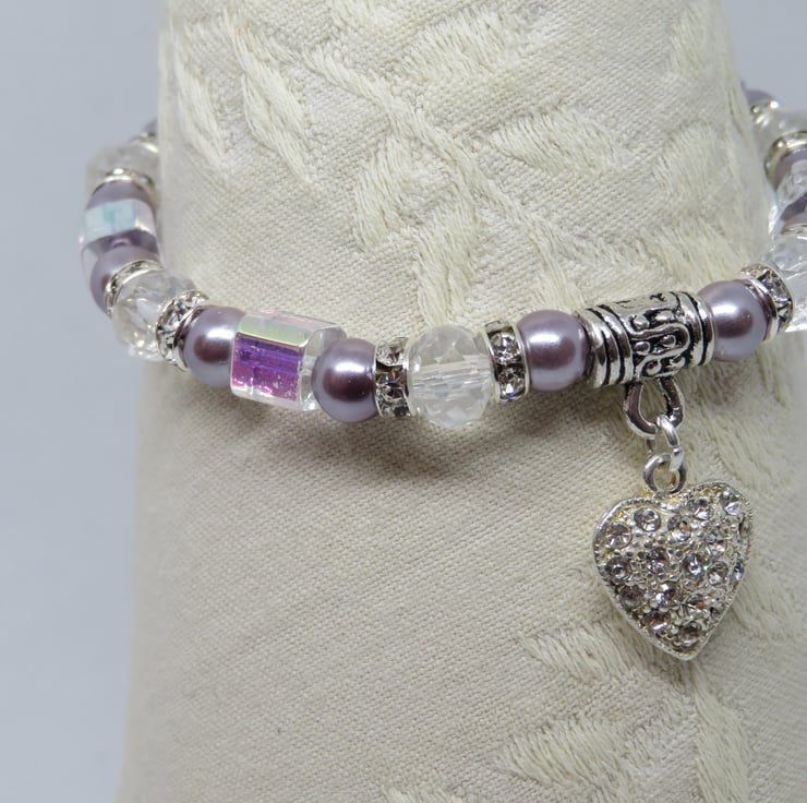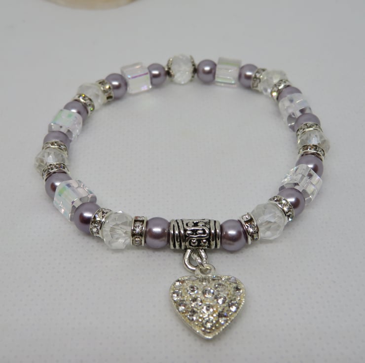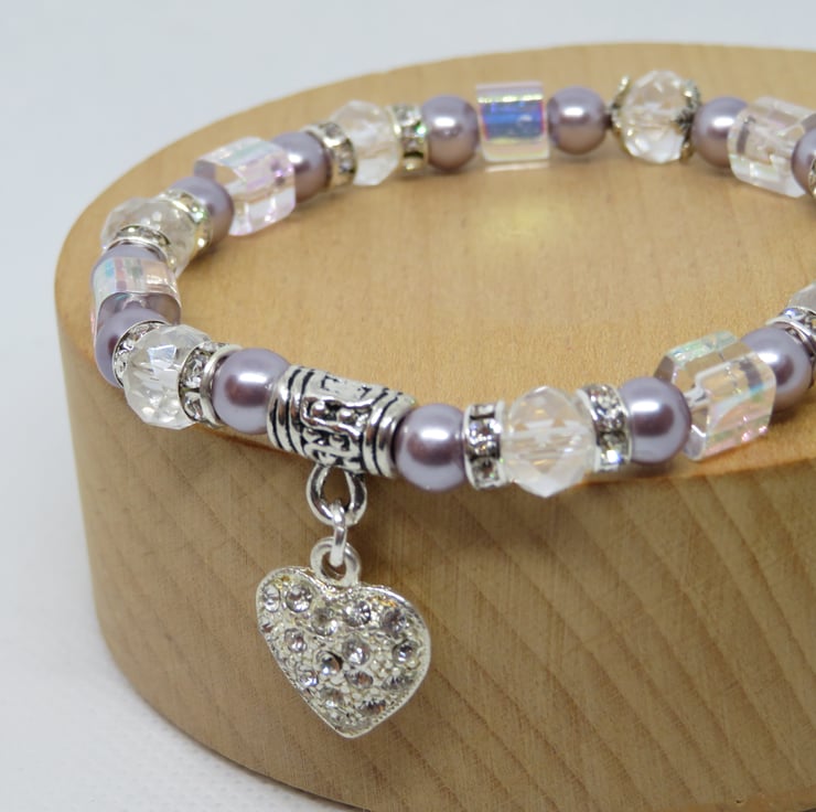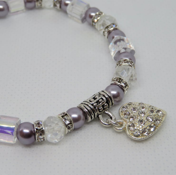A pretty diamante heart charm is suspended from a tibetan silver charm carrier in this lovely stretch bracelet. The bracelet is composed of mauve glass pearls, diamante spacers, clear crystal rondelles, bead caps and unusual glass cube beads which have an iridescent coating. All the beads are securely strung on jeweller's elastic. This bracelet measures 6.5 inches (unstretched). If you are unsure of the sizing please contact me and I can make the bracelet to your exact requirements.