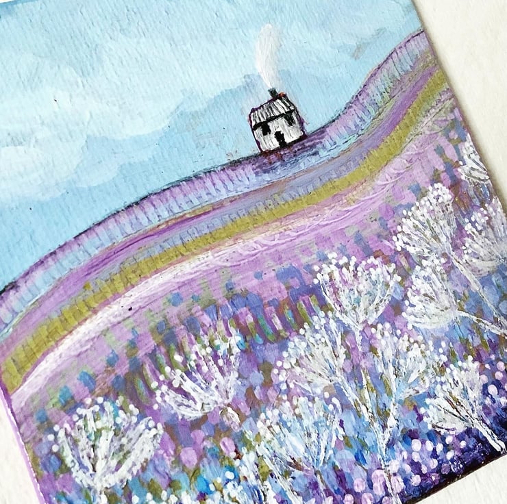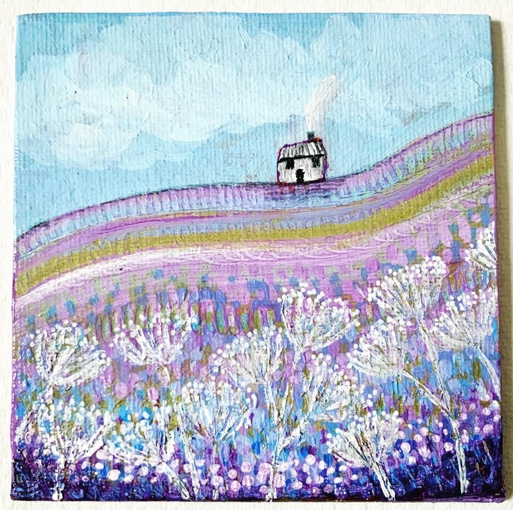 An original acrylic painting, painted on a 10x10cm canvas board which is unmounted and unframed to allow you to choose a frame in your own style. These little canvases could also be displayed on a shelf or mantelpiece. It features a little cottage on a hill, sitting amongst purple fields.