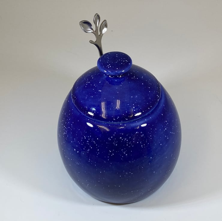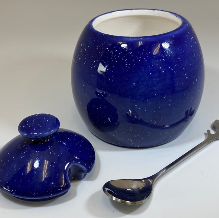 A stunning modern looking ceramic sugar bowl with matching lid and a stainless steel leafy spoon. The perfect addition for any kitchen or table. Handcrafted with all of the care and attention that you would expect from an artisan. These sugar bowls are individually hand glazed and fired in my own electric kiln in Somerset, England and not mass produced in a factory in a far away land..!