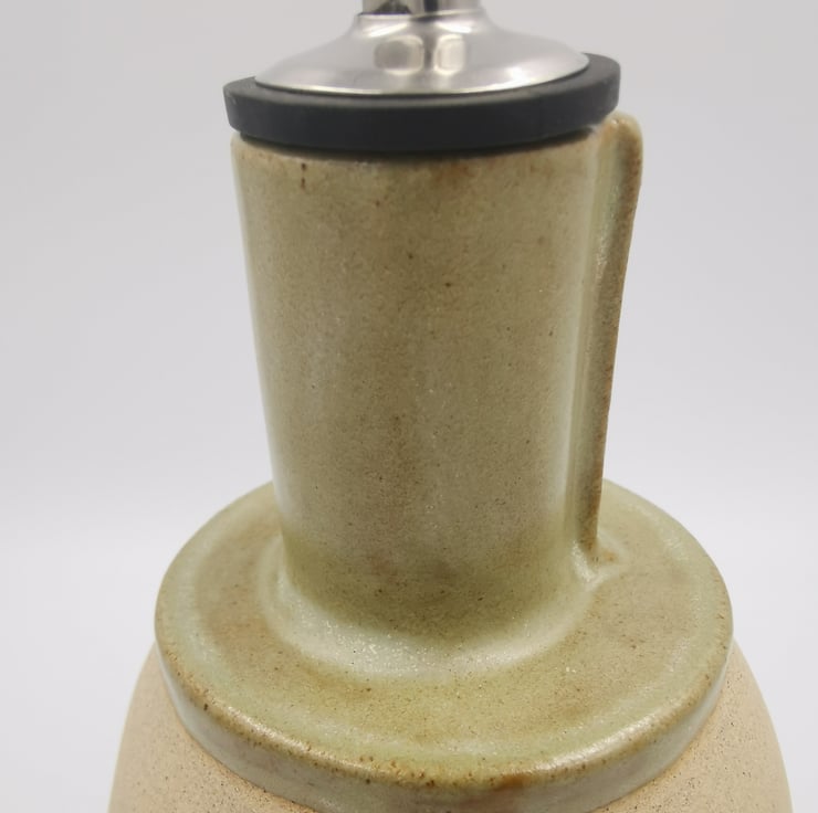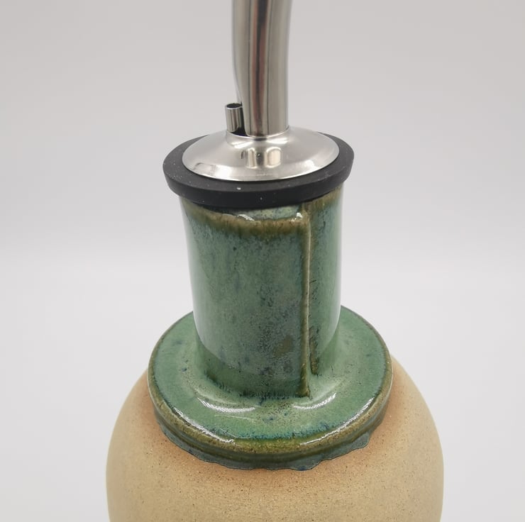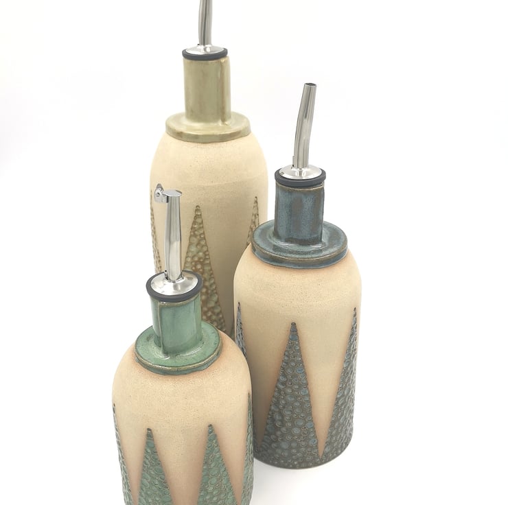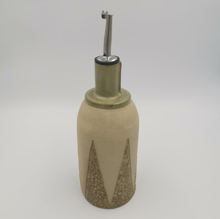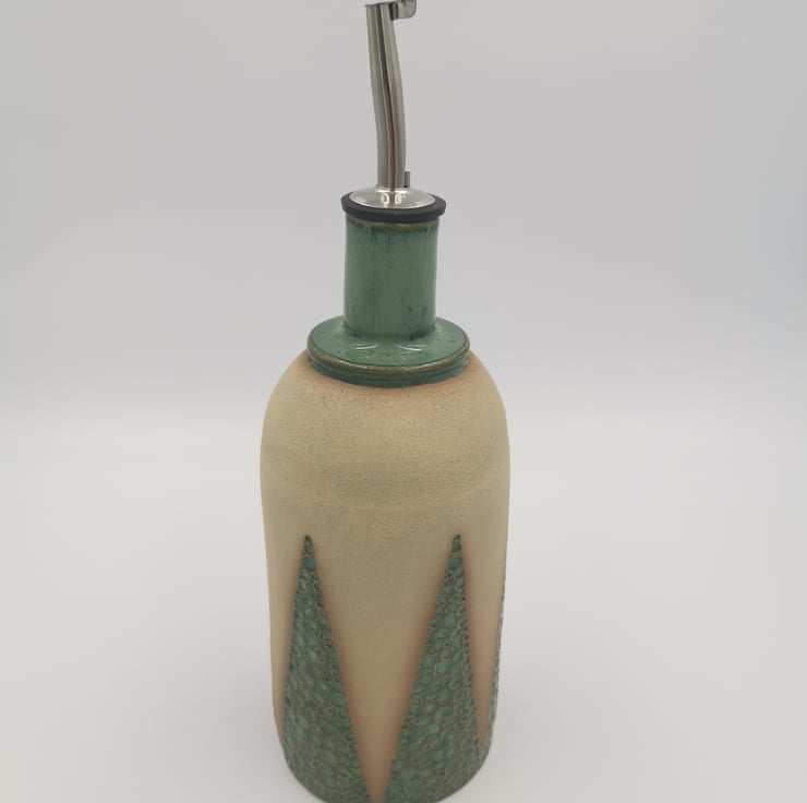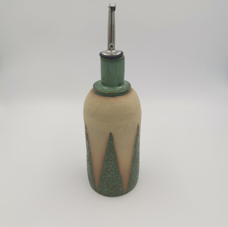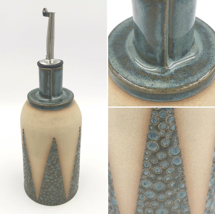The slabs are impressed with modelling tools to give a bubbled surface texture in a triangular design. The slab is then wrapped to form a cylinder and slabs added and shaped to taper the top. The neck of the drizzler is a design which can be found in many of my other pieces and is made by wrapping a slab of clay and joining it to the main body. The drizzler is finished with a stainless steel pourer.
