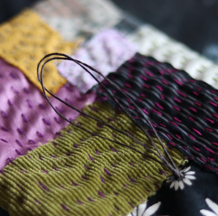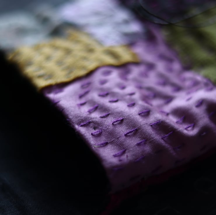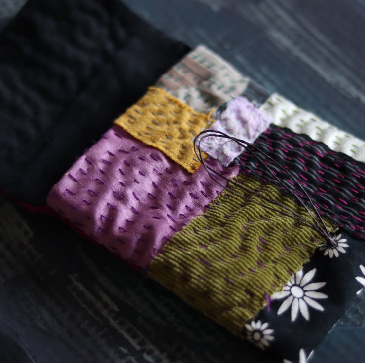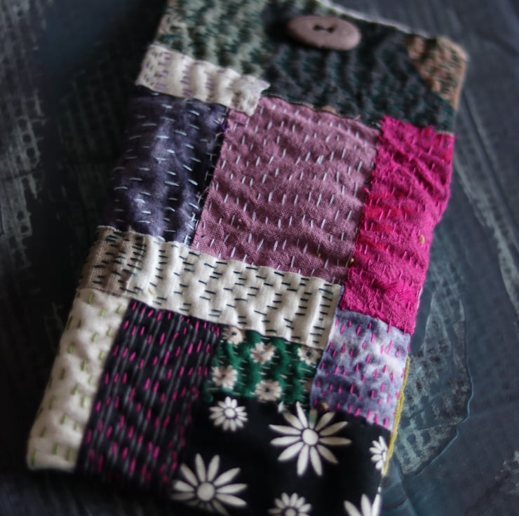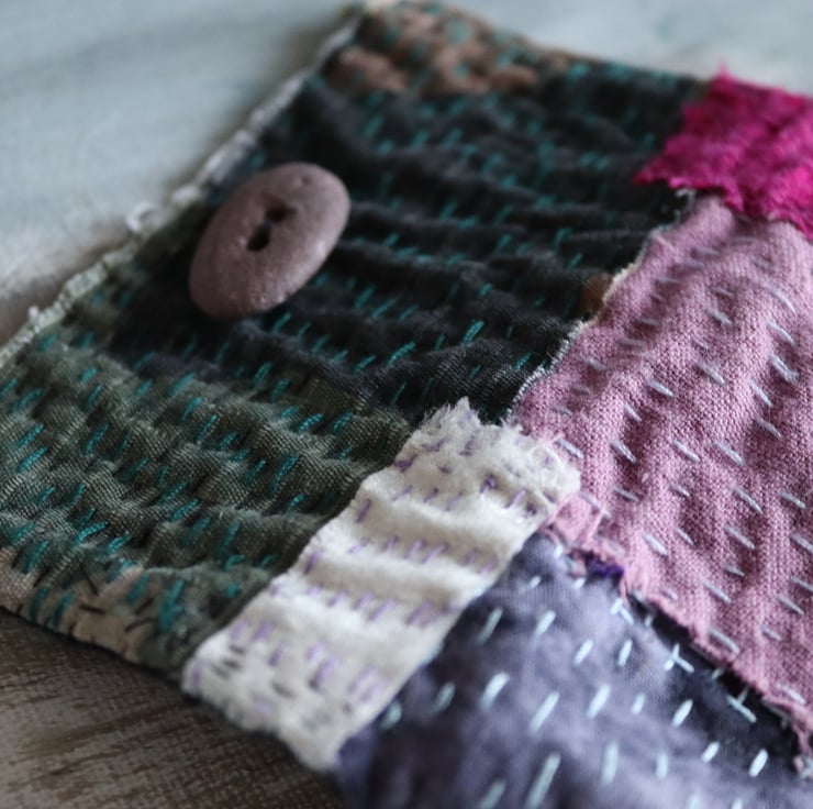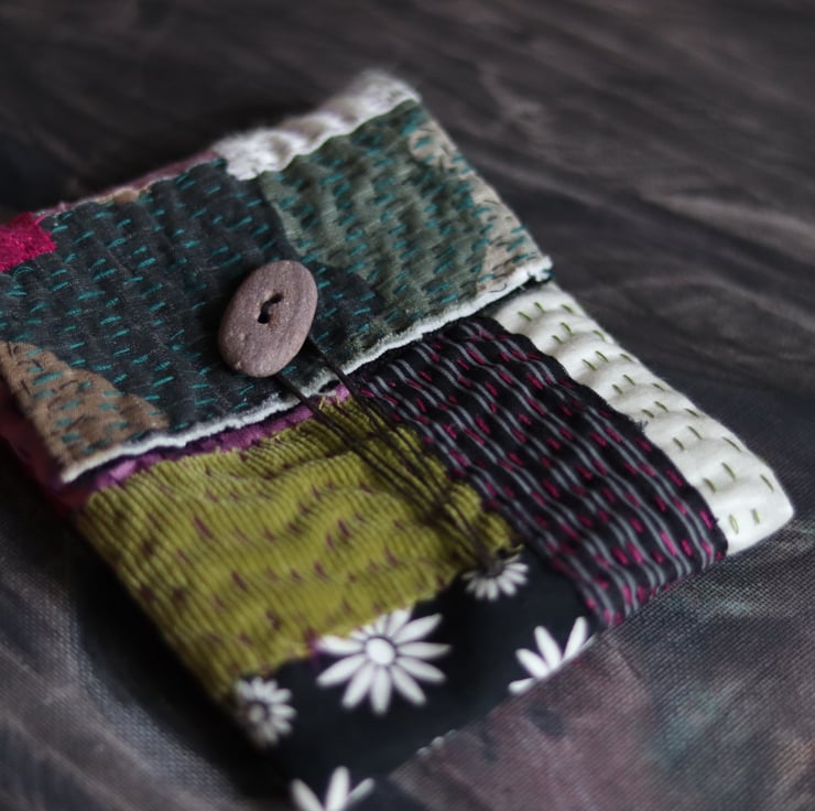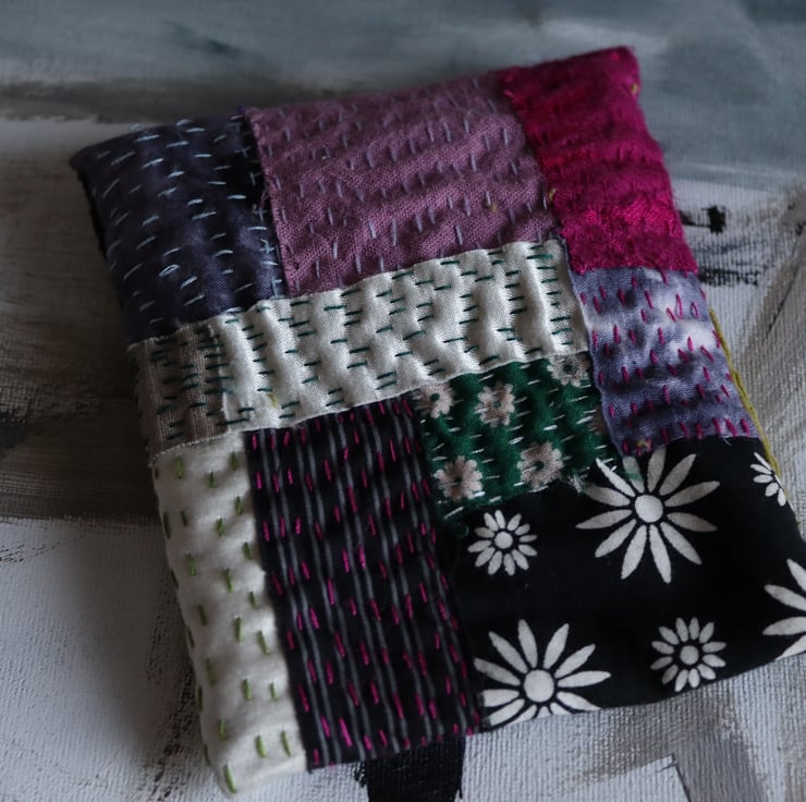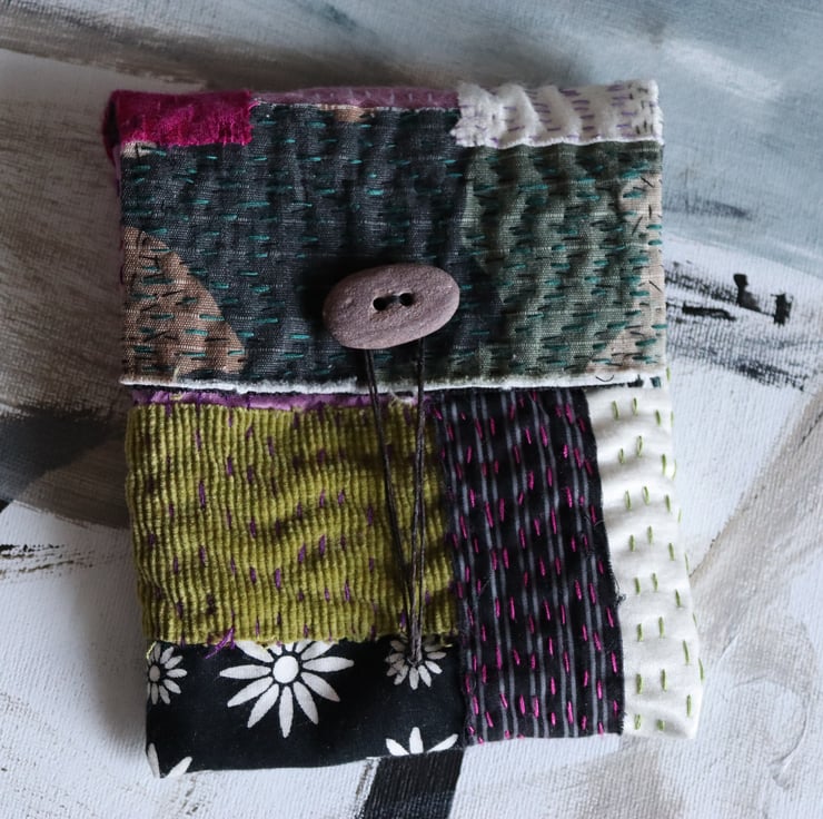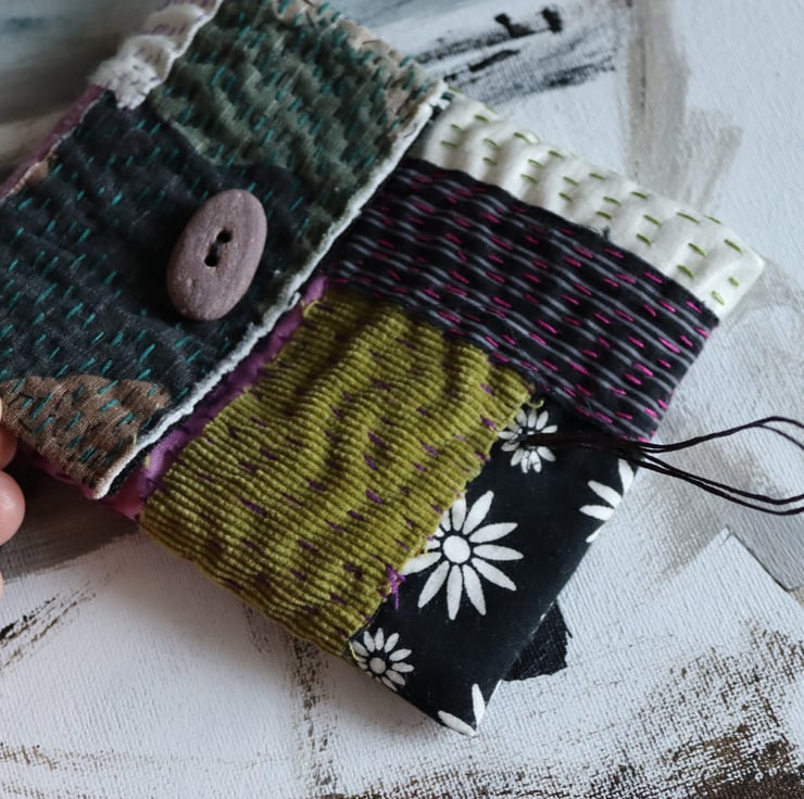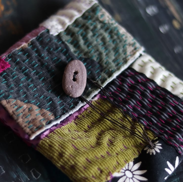 a scrappy little cloth pouch. made from bits of pre-loved fabric, slowstiched into a soft textured cloth. lined with a black linen. with a seaworn pebble button & waxed linen thread, fastener.