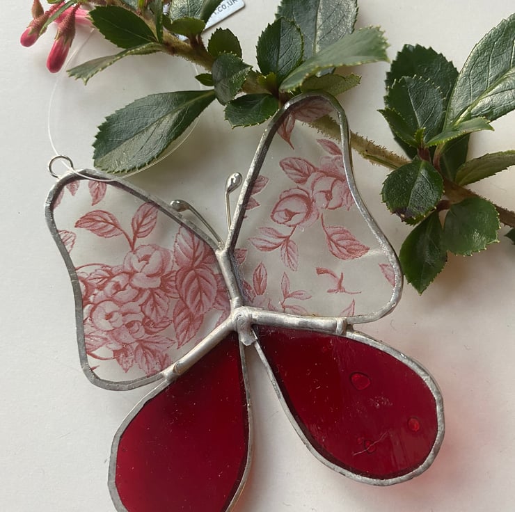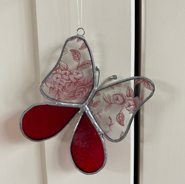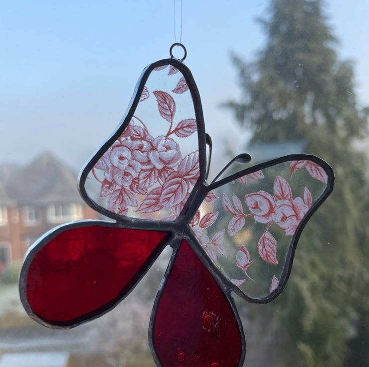 A beautiful stained glass butterfly made using the Tiffany ( copper foiled ) method of stained glass . The 2 main wings are made with a glass printed with pink roses and the bottom wings are a beautiful red .It has a hanging nylon thread . It is completed with wire antenna.