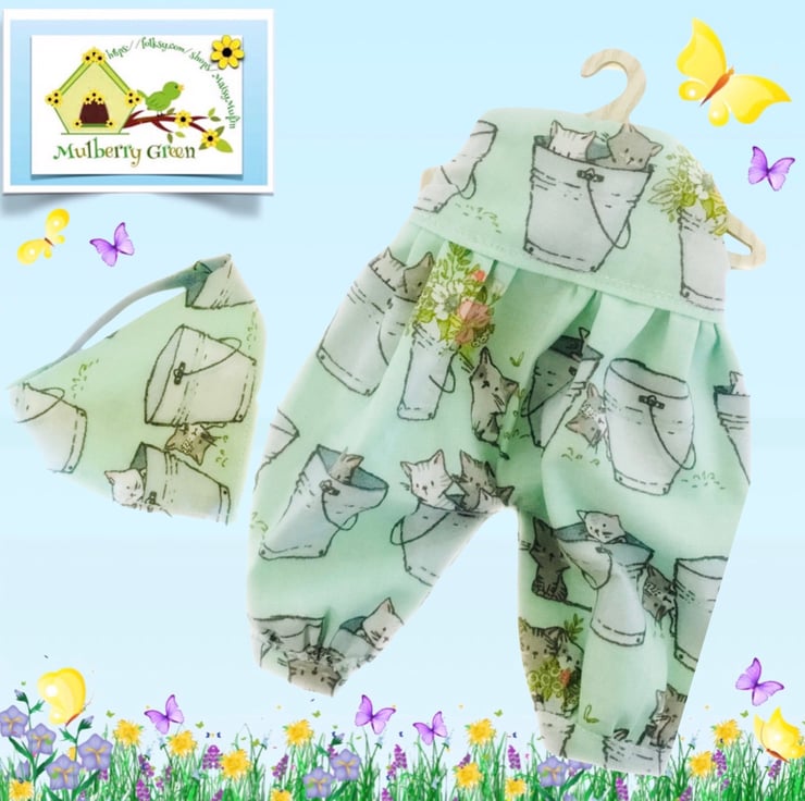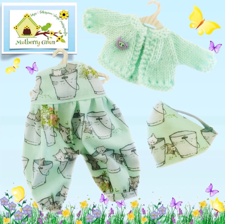 A really cute little playsuit with a matching headscarf in a lovely kittens print to fit the Mulberry Green characters. The playsuit is made from cotton, has gathered legs and a lined bodice and comes on a cute little wooden hanger. The headscarf has an elasticated back. It looks good with the turquoise shortie cardigan.